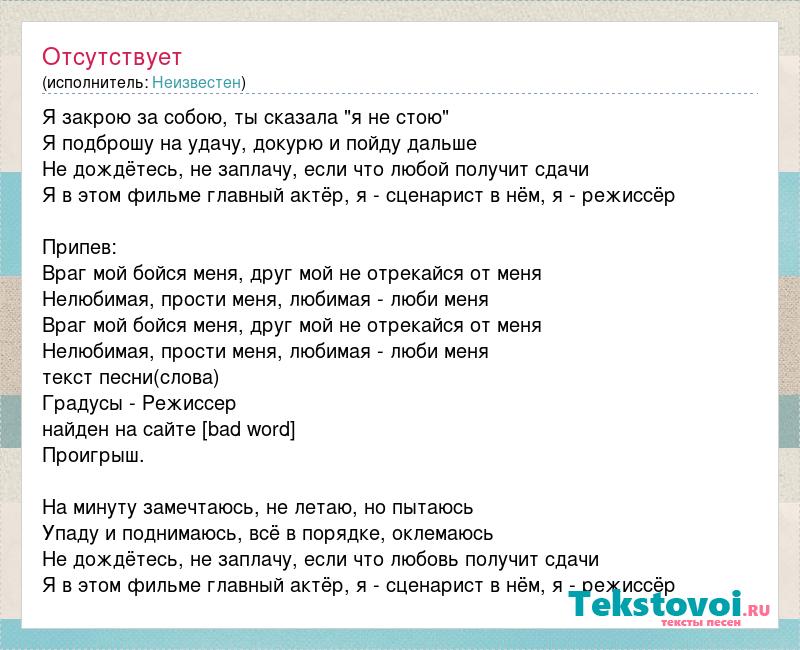 Я закрою за собою, ты сказала "я не стою" Я подброшу на удачу, докурю и пойду дальше Не дождётесь, не заплачу, если что любой получит сдачи Я в этом фильме главный актёр, я - сценарист в нём, я - режиссёр Припев: Враг мой бойся меня, друг мой не отрекайся от меня Нелюбимая, прости меня, любимая - люби меня Враг мой бойся меня, друг мой не отрекайся от меня Нелюбимая, прости меня, любимая - люби меня текст песни(слова) Градусы - Режиссер найден на сайте [bad word] Проигрыш. На минуту замечтаюсь, не летаю, но пытаюсь Упаду и поднимаюсь, всё в порядке, оклемаюсь Не дождётесь, не заплачу, если что любовь получит сдачи Я в этом фильме главный актёр, я - сценарист в нём, я - режиссёр