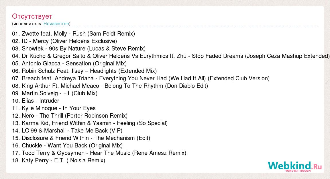 01. Zwette feat. Molly - Rush (Sam Feldt Remix) 02. ID - Mercy (Oliver Heldens Exclusive) 03. Showtek - 90s By Nature (Lucas & Steve Remix) 04. Dr Kucho & Gregor Salto & Oliver Heldens Vs Eurythmics ft. Zhu - Stop Faded Dreams (Joseph Ceza Mashup Extended) 05. Antonio Giacca - Sensation (Original Mix) 06. Robin Schulz Feat. Ilsey – Headlights (Extended Mix) 07. Breach feat. Andreya Triana - Everything You Never Had (We Had It All) (Extended Club Version) 08. King Arthur Ft. Michael Meaco - Belong To The Rhythm (Don Diablo Edit) 09. Martin Solveig - +1 (Club Mix) 10. Elias - Intruder 11. Kylie Minoque - In Your Eyes 12. Nero - The Thrill (Porter Robinson Remix) 13. Karma Kid, Friend Within & Yasmin - Feeling (So Special) 14. LO'99 & Marshall - Take Me Back (VIP) 15. Disclosure & Friend Within - The Mechanism (Edit) 16. Chuckie - Want You Back (Original Mix) 17. Todd Terry & Gypsymen - Hear The Music (Rene Amesz Remix) 18. Katy Perry - E.T. ( Noisia Remix)