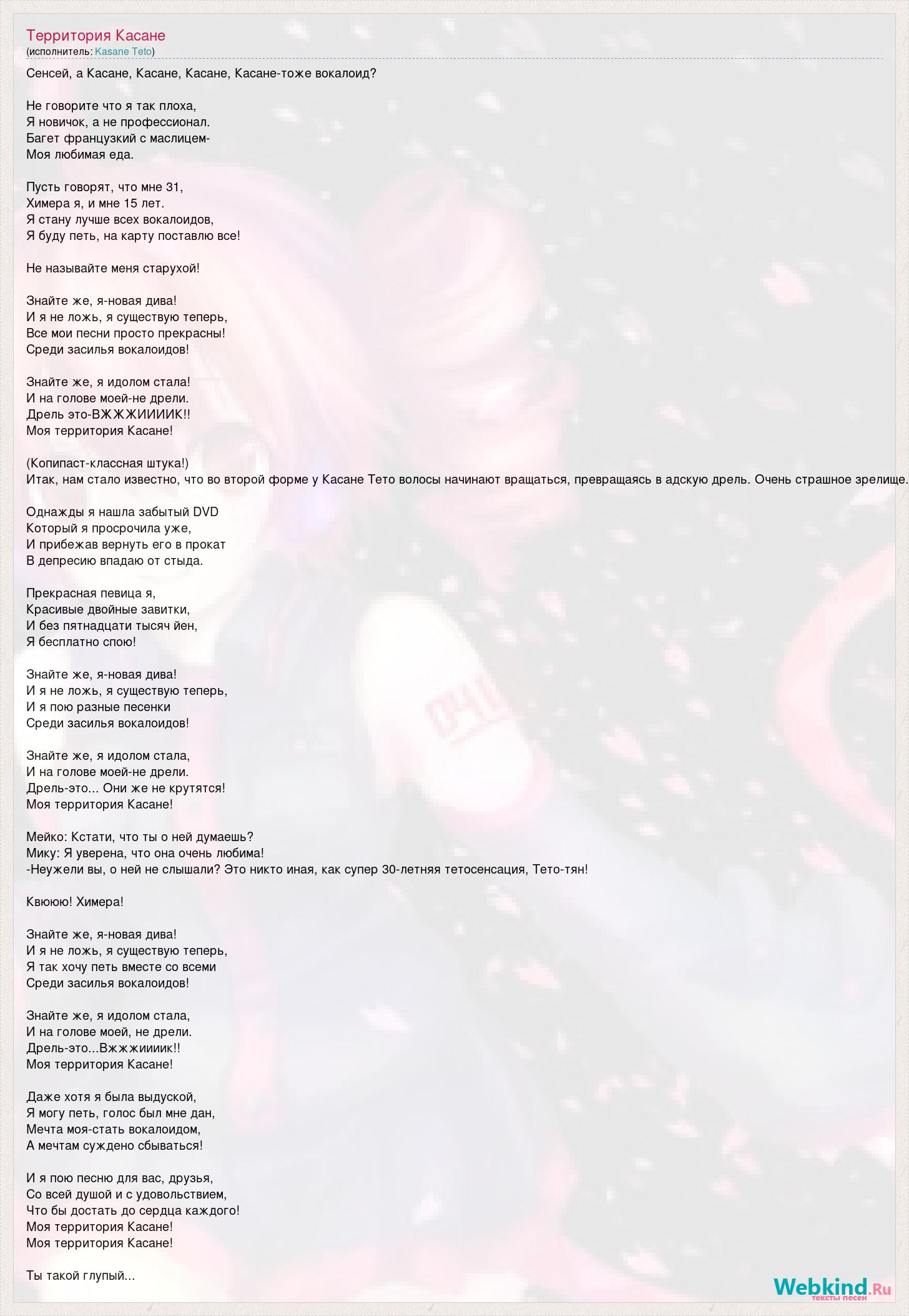 Сенсей, а Касане, Касане, Касане, Касане-тоже вокалоид? Не говорите что я так плоха, Я новичок, а не профессионал. Багет французкий с маслицем- Моя любимая еда. Пусть говорят, что мне 31, Химера я, и мне 15 лет. Я стану лучше всех вокалоидов, Я буду петь, на карту поставлю все! Не называйте меня старухой! Знайте же, я-новая дива! И я не ложь, я существую теперь, Все мои песни просто прекрасны! Среди засилья вокалоидов! Знайте же, я идолом стала! И на голове моей-не дрели. Дрель это-ВЖЖЖИИИИК!! Моя территория Касане! (Копипаст-классная штука!) Итак, нам стало известно, что во второй форме у Касане Тето волосы начинают вращаться, превращаясь в адскую дрель. Очень страшное зрелище. Однажды я нашла забытый DVD Который я просрочила уже, И прибежав вернуть его в прокат В депресию впадаю от стыда. Прекрасная певица я, Красивые двойные завитки, И без пятнадцати тысяч йен, Я бесплатно спою! Знайте же, я-новая дива! И я не ложь, я существую теперь, И я пою разные песенки Среди засилья вокалоидов! Знайте же, я идолом стала, И на голове моей-не дрели. Дрель-это... Они же не крутятся! Моя территория Касане! Мейко: Кстати, что ты о ней думаешь? Мику: Я уверена, что она очень любима! -Неужели вы, о ней не слышали? Это никто иная, как супер 30-летняя тетосенсация, Тето-тян! Квююю! Химера! Знайте же, я-новая дива! И я не ложь, я существую теперь, Я так хочу петь вместе со всеми Среди засилья вокалоидов! Знайте же, я идолом стала, И на голове моей, не дрели. Дрель-это...Вжжжиииик!! Моя территория Касане! Даже хотя я была выдуской, Я могу петь, голос был мне дан, Мечта моя-стать вокалоидом, А мечтам суждено сбываться! И я пою песню для вас, друзья, Со всей душой и с удовольствием, Что бы достать до сердца каждого! Моя территория Касане! Моя территория Касане! Ты такой глупый...
