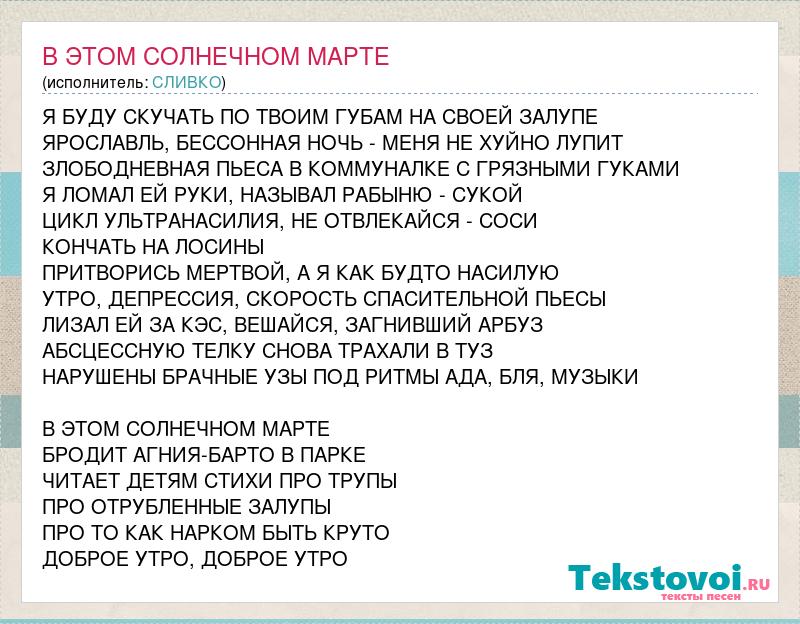 Я БУДУ СКУЧАТЬ ПО ТВОИМ ГУБАМ НА СВОЕЙ ЗАЛУПЕ ЯРОСЛАВЛЬ, БЕССОННАЯ НОЧЬ - МЕНЯ НЕ ХУЙНО ЛУПИТ ЗЛОБОДНЕВНАЯ ПЬЕСА В КОММУНАЛКЕ С ГРЯЗНЫМИ ГУКАМИ Я ЛОМАЛ ЕЙ РУКИ, НАЗЫВАЛ РАБЫНЮ - СУКОЙ ЦИКЛ УЛЬТРАНАСИЛИЯ, НЕ ОТВЛЕКАЙСЯ - СОСИ КОНЧАТЬ НА ЛОСИНЫ ПРИТВОРИСЬ МЕРТВОЙ, А Я КАК БУДТО НАСИЛУЮ УТРО, ДЕПРЕССИЯ, СКОРОСТЬ СПАСИТЕЛЬНОЙ ПЬЕСЫ ЛИЗАЛ ЕЙ ЗА КЭС, ВЕШАЙСЯ, ЗАГНИВШИЙ АРБУЗ АБСЦЕССНУЮ ТЕЛКУ СНОВА ТРАХАЛИ В ТУЗ НАРУШЕНЫ БРАЧНЫЕ УЗЫ ПОД РИТМЫ АДА, БЛЯ, МУЗЫКИ В ЭТОМ СОЛНЕЧНОМ МАРТЕ БРОДИТ АГНИЯ-БАРТО В ПАРКЕ ЧИТАЕТ ДЕТЯМ СТИХИ ПРО ТРУПЫ ПРО ОТРУБЛЕННЫЕ ЗАЛУПЫ ПРО ТО КАК НАРКОМ БЫТЬ КРУТО ДОБРОЕ УТРО, ДОБРОЕ УТРО