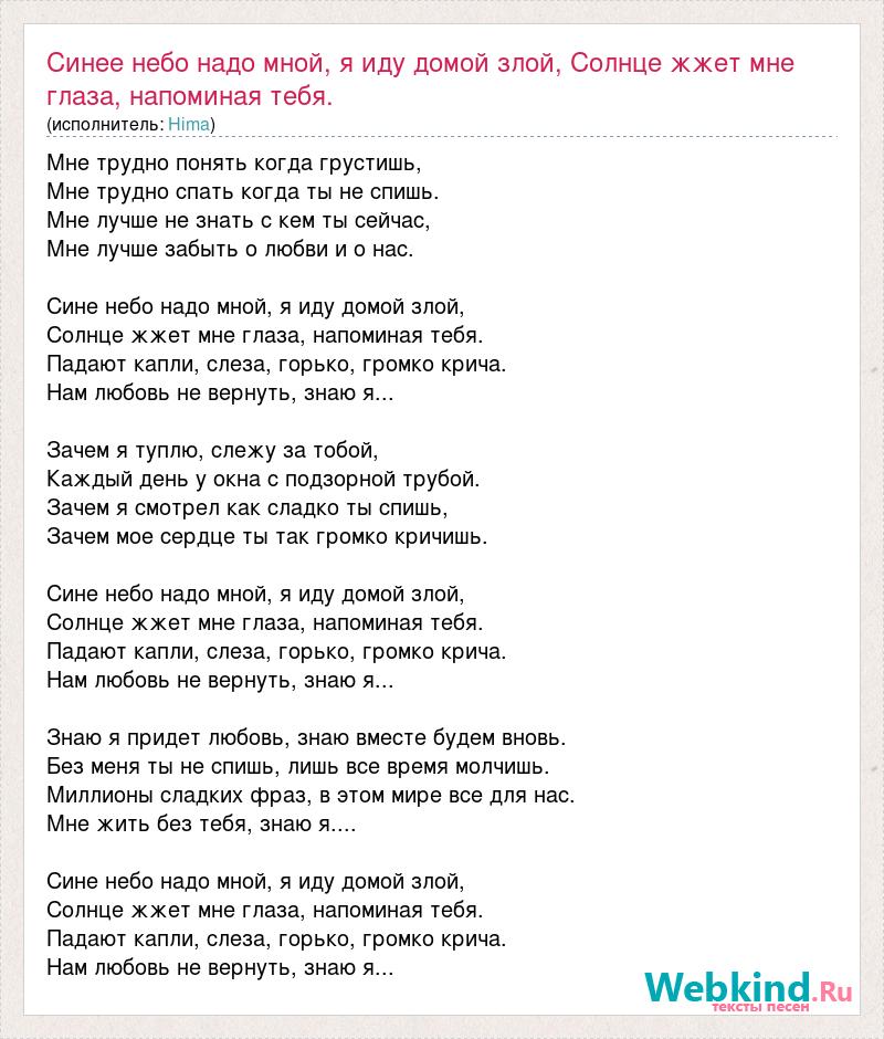 Главная→Исполнители→Hima→Синее небо надо мной, я иду домой злой, Солнце жжет мне глаза, напоминая тебя.