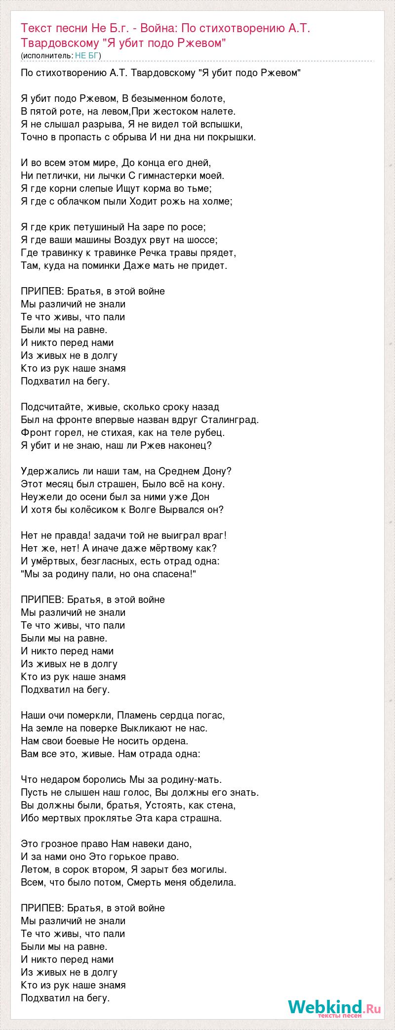 Главная→Исполнители→НЕ БГ→Текст песни Не Б.г. - Война: По стихотворению А.Т. Твардовскому "Я убит подо Рж