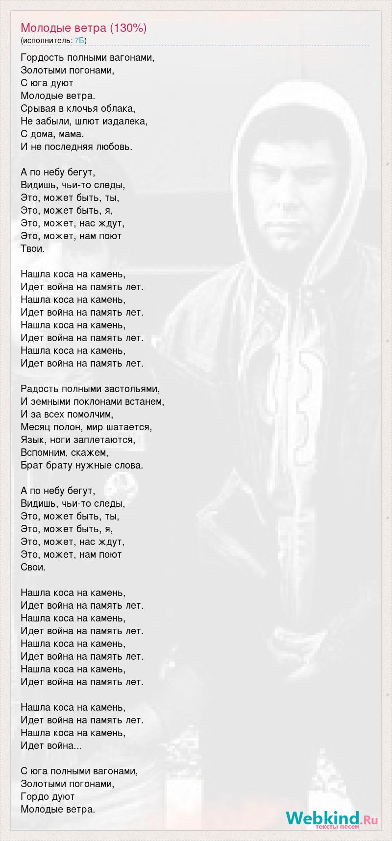 Гордость полными вагонами, Золотыми погонами, С юга дуют Молодые ветра. Срывая в клочья облака, Не забыли, шлют издалека, С дома, мама. И не последняя любовь. А по небу бегут, Видишь, чьи-то следы, Это, может быть, ты, Это, может быть, я, Это, может, нас ждут, Это, может, нам поют Твои. Нашла коса на камень, Идет война на память лет. Нашла коса на камень, Идет война на память лет. Нашла коса на камень, Идет война на память лет. Нашла коса на камень, Идет война на память лет. Радость полными застольями, И земными поклонами встанем, И за всех помолчим, Месяц полон, мир шатается, Язык, ноги заплетаются, Вспомним, скажем, Брат брату нужные слова. А по небу бегут, Видишь, чьи-то следы, Это, может быть, ты, Это, может быть, я, Это, может, нас ждут, Это, может, нам поют Свои. Нашла коса на камень, Идет война на память лет. Нашла коса на камень, Идет война на память лет. Нашла коса на камень, Идет война на память лет. Нашла коса на камень, Идет война на память лет. Нашла коса на камень, Идет война на память лет. Нашла коса на камень, Идет война... С юга полными вагонами, Золотыми погонами, Гордо дуют Молодые ветра.