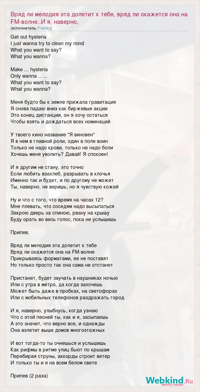Get out hysteria I just wanna try to clean my mind What you want to say? What you wanna? Make ... hysteria Only wanna .. ... What you want to say? What you wanna? Меня будто бы к земле прижала гравитация Я снова падаю вниз как биржевые акции Это конец дистанции, он я хочу остаться Чтобы взять и дождаться всех номинаций У твоего кино название "Я виновен" Я в нем в главной роли, один в поле воин Только не надо крови, только не надо боли Хочешь меня уволить? Давай! Я спокоен! И я другим не стану, это точно Если любить взахлеб, разрывать в клочья Именно так и будет, и по другому не может Ты, наверно, не веришь, но я чувствую кожей Ну и что с того, что время на часах 12? Мне плевать, что соседям надо высыпаться Закрою дверь за спиною, рвану на крышу Буду орать во весь голос, пока не услышишь Припев. Вряд ли мелодия эта долетит к тебе Вряд ли окажется она на FM-волне Прикрываясь форматами, ее не поставят Но только просто так она сама не отстанет Пристанет, будет звучать в наушниках ночью Или с утра в метро, да когда захочешь Может быть даже в пробках, на светофорах Или с мобильных телефонов раздражать город И я, наверно, улыбнусь, когда узнаю Что с этой песней ты, как и я, засыпаешь А это значит, что верно все, и однажды Она взлетит выше домов многоэтажных И вот тогда-то ты очнешься и услышишь Как рифмы в ритме улиц бьют по крышам Перебирая струны, аккорды строит ветер И только ты и я на всем белом свете Припев (2 раза)