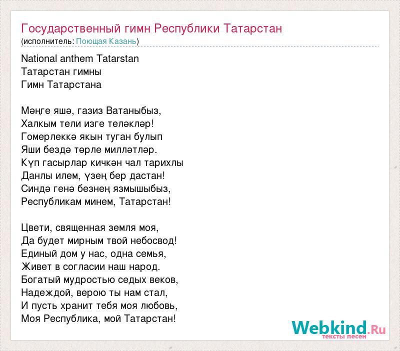 National anthem Tatarstan Татарстан гимны Гимн Татарстана Мәңге яшә, газиз Ватаныбыз, Халкым тели изге теләкләр! Гомерлеккә якын туган булып Яши бездә төрле милләтләр. Күп гасырлар кичкән чал тарихлы Данлы илем, үзең бер дастан! Синдә генә безнең язмышыбыз, Республикам минем, Татарстан! Цвети, священная земля моя, Да будет мирным твой небосвод! Единый дом у нас, одна семья, Живет в согласии наш народ. Богатый мудростью седых веков, Надеждой, верою ты нам стал, И пусть хранит тебя моя любовь, Моя Республика, мой Татарстан!