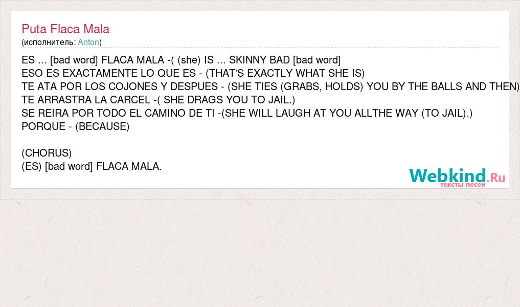 ES ... [bad word] FLACA MALA -( (she) IS ... SKINNY BAD [bad word] ESO ES EXACTAMENTE LO QUE ES - (THAT'S EXACTLY WHAT SHE IS) TE ATA POR LOS COJONES Y DESPUES - (SHE TIES (GRABS, HOLDS) YOU BY THE BALLS AND THEN) TE ARRASTRA LA CARCEL -( SHE DRAGS YOU TO JAIL.) SE REIRA POR TODO EL CAMINO DE TI -(SHE WILL LAUGH AT YOU ALLTHE WAY (TO JAIL).) PORQUE - (BECAUSE) (CHORUS) (ES) [bad word] FLACA MALA.