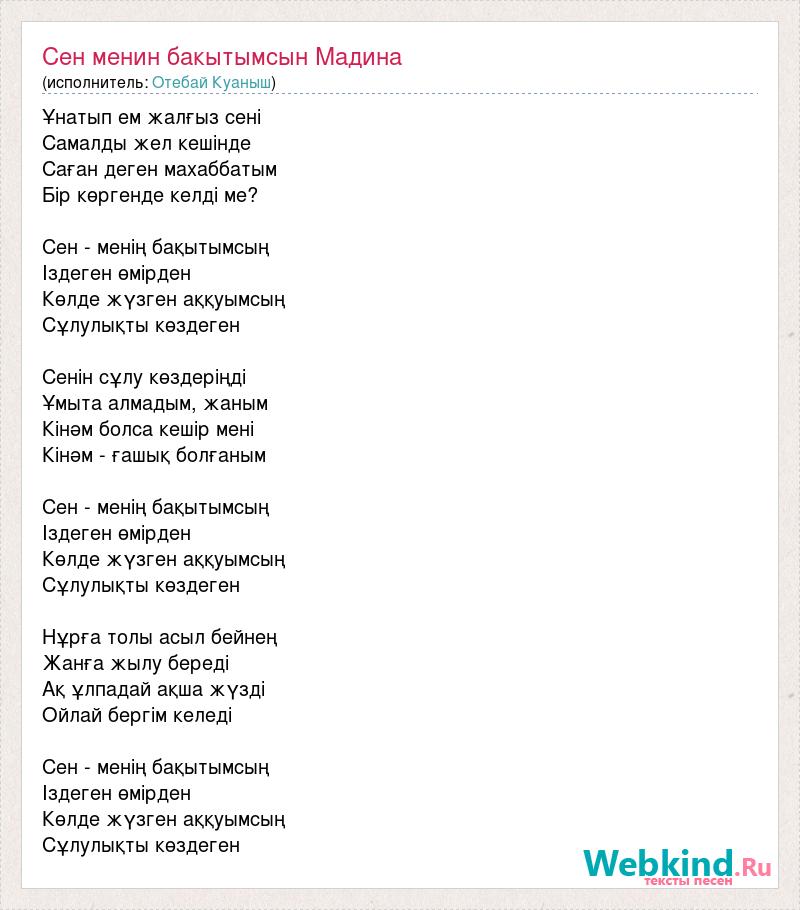 Ұнатып ем жалғыз сені Самалды жел кешінде Саған деген махаббатым Бір көргенде келді ме? Сен - менің бақытымсың Іздеген өмірден Көлде жүзген аққуымсың Сұлулықты көздеген Сенін сұлу көздеріңді Ұмыта алмадым, жаным Кінәм болса кешір мені Кінәм - ғашық болғаным Сен - менің бақытымсың Іздеген өмірден Көлде жүзген аққуымсың Сұлулықты көздеген Нұрға толы асыл бейнең Жанға жылу береді Ақ ұлпадай ақша жүзді Ойлай бергім келеді Сен - менің бақытымсың Іздеген өмірден Көлде жүзген аққуымсың Сұлулықты көздеген