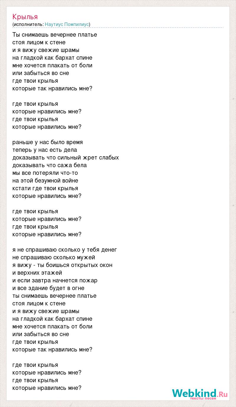 Ты снимаешь вечернее платье стоя лицом к стене и я вижу свежие шрамы на гладкой как бархат спине мне хочется плакать от боли или забыться во сне где твои крылья которые так нравились мне? где твои крылья которые нравились мне? где твои крылья которые нравились мне? раньше у нас было время теперь у нас есть дела доказывать что сильный жрет слабых доказывать что сажа бела мы все потеряли что-то на этой безумной войне кстати где твои крылья которые нравились мне? где твои крылья которые нравились мне? где твои крылья которые нравились мне? я не спрашиваю сколько у тебя денег не спрашиваю сколько мужей я вижу - ты боишься открытых окон и верхних этажей и если завтра начнется пожар и все здание будет в огне ты снимаешь вечернее платье стоя лицом к стене и я вижу свежие шрамы на гладкой как бархат спине мне хочется плакать от боли или забыться во сне где твои крылья которые так нравились мне? где твои крылья которые нравились мне? где твои крылья которые нравились мне?