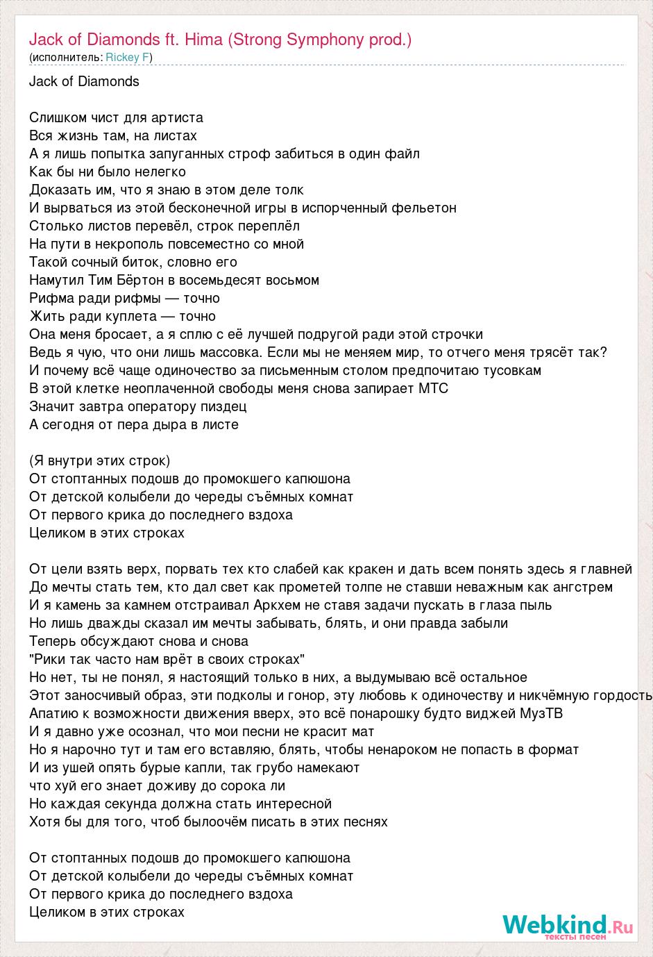 Jack of Diamonds Слишком чист для артиста Вся жизнь там, на листах А я лишь попытка запуганных строф забиться в один файл Как бы ни было нелегко Доказать им, что я знаю в этом деле толк И вырваться из этой бесконечной игры в испорченный фельетон Столько листов перевёл, строк переплёл На пути в некрополь повсеместно со мной Такой сочный биток, словно его Намутил Тим Бёртон в восемьдесят восьмом Рифма ради рифмы — точно Жить ради куплета — точно Она меня бросает, а я сплю с её лучшей подругой ради этой строчки Ведь я чую, что они лишь массовка. Если мы не меняем мир, то отчего меня трясёт так? И почему всё чаще одиночество за письменным столом предпочитаю тусовкам В этой клетке неоплаченной свободы меня снова запирает МТС Значит завтра оператору пиздец А сегодня от пера дыра в листе (Я внутри этих строк) От стоптанных подошв до промокшего капюшона От детской колыбели до череды съёмных комнат От первого крика до последнего вздоха Целиком в этих строках От цели взять верх, порвать тех кто слабей как кракен и дать всем понять здесь я главней До мечты стать тем, кто дал свет как прометей толпе не ставши неважным как ангстрем И я камень за камнем отстраивал Аркхем не ставя задачи пускать в глаза пыль Но лишь дважды сказал им мечты забывать, блять, и они правда забыли Теперь обсуждают снова и снова "Рики так часто нам врёт в своих строках" Но нет, ты не понял, я настоящий только в них, а выдумываю всё остальное Этот заносчивый образ, эти подколы и гонор, эту любовь к одиночеству и никчёмную гордость Апатию к возможности движения вверх, это всё понарошку будто виджей МузТВ И я давно уже осознал, что мои песни не красит мат Но я нарочно тут и там его вставляю, блять, чтобы ненароком не попасть в формат И из ушей опять бурые капли, так грубо намекают что хуй его знает доживу до сорока ли Но каждая секунда должна стать интересной Хотя бы для того, чтоб былоочём писать в этих песнях От стоптанных подошв до промокшего капюшона От детской колыбели до череды съёмных комнат От первого крика до последнего вздоха Целиком в этих строках