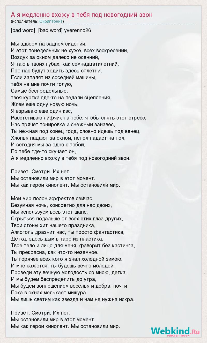[bad word] [bad word] yverenno26 Мы вдвоем на заднем сидении, И этот понедельник не хуже, всех воскресений, Воздух за окном далеко не осенний, Я таю в твоих губах, как семнадцатилетний, Про нас будут ходить здесь сплетни, Если запалят из соседней машины, тебя на мне почти голую, Самые беспредельные, твоя куртка где-то на педали сцепления, Жгем еще одну новую ночь, Я взрываю еще один кэс, Расстегиваю лифчик на тебе, чтобы снять этот стресс, Нас прячет тонировка и снежный занавес, Ты нежная под конец года, словно идешь под венец, Хлопья падают за окном, пепел падает на пол, И сегодня мы за одно с тобой, По тебе где-то скучает он, А я медленно вхожу в тебя под новогодний звон. Привет. Смотри. Их нет. Мы остановили мир в этот момент. Мы как герои кинолент. Мы остановили мир. Мой мир полон эффектов сейчас, Безумная ночь, конкретно для нас двоих, Мы используем весь этот шанс, Скрыться подальше от всех этих глаз других, Твои стоны хит нашего праздника, Алкоголь дразнит нас, ты просто фантастика, Детка, здесь дым в таре из пластика, Твое тело и лицо для меня, фаворит без кастинга, Ты прекрасна, как что-то неземное. Ты горячее всех кого я знал холодной зимою. И мне кажется, ты будешь вечно молодой, Проведи эту вечную молодость со мною, детка. И мы будем беспределить до утра, Мы будем воплощением веселья и добра, почти Пока в окнах мелькает мишура Мы лишь светим как звезда и нам не нужна искра. Привет. Смотри. Их нет. Мы остановили мир в этот момент. Мы как герои кинолент. Мы остановили мир.