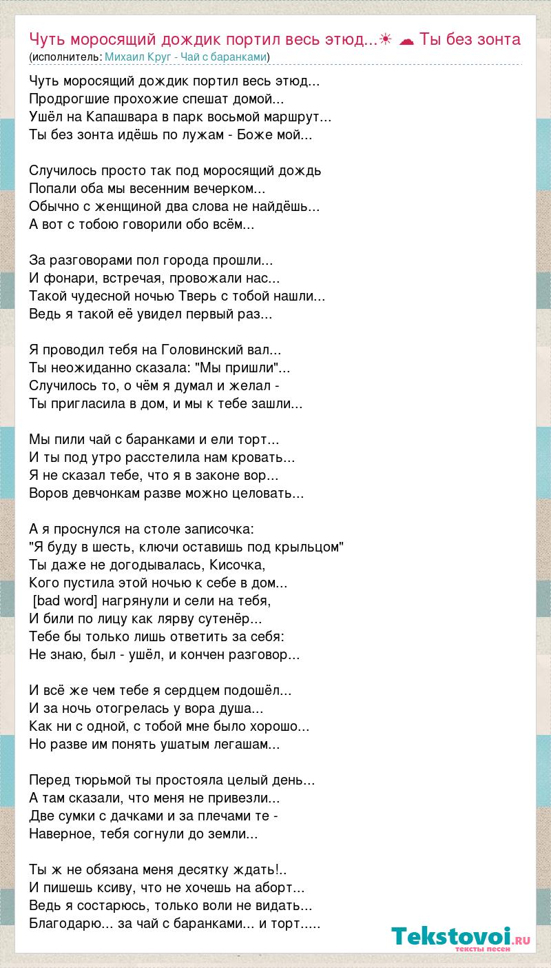 Чуть моросящий дождик портил весь этюд... Продрогшие прохожие спешат домой... Ушёл на Капашвара в парк восьмой маршрут... Ты без зонта идёшь по лужам - Боже мой... Случилось просто так под моросящий дождь Попали оба мы весенним вечерком... Обычно с женщиной два слова не найдёшь... А вот с тобою говорили обо всём... За разговорами пол города прошли... И фонари, встречая, провожали нас... Такой чудесной ночью Тверь с тобой нашли... Ведь я такой её увидел первый раз... Я проводил тебя на Головинский вал... Ты неожиданно сказала: "Мы пришли"... Случилось то, о чём я думал и желал - Ты пригласила в дом, и мы к тебе зашли... Мы пили чай с баранками и ели торт... И ты под утро расстелила нам кровать... Я не сказал тебе, что я в законе вор... Воров девчонкам разве можно целовать... А я проснулся на столе записочка: "Я буду в шесть, ключи оставишь под крыльцом" Ты даже не догодывалась, Кисочка, Кого пустила этой ночью к себе в дом... [bad word] нагрянули и сели на тебя, И били по лицу как лярву сутенёр... Тебе бы только лишь ответить за себя: Не знаю, был - ушёл, и кончен разговор... И всё же чем тебе я сердцем подошёл... И за ночь отогрелась у вора душа... Как ни с одной, с тобой мне было хорошо... Но разве им понять ушатым легашам... Перед тюрьмой ты простояла целый день... А там сказали, что меня не привезли... Две сумки с дачками и за плечами те - Наверное, тебя согнули до земли... Ты ж не обязана меня десятку ждать!.. И пишешь ксиву, что не хочешь на аборт... Ведь я состарюсь, только воли не видать... Благодарю... за чай с баранками... и торт.....