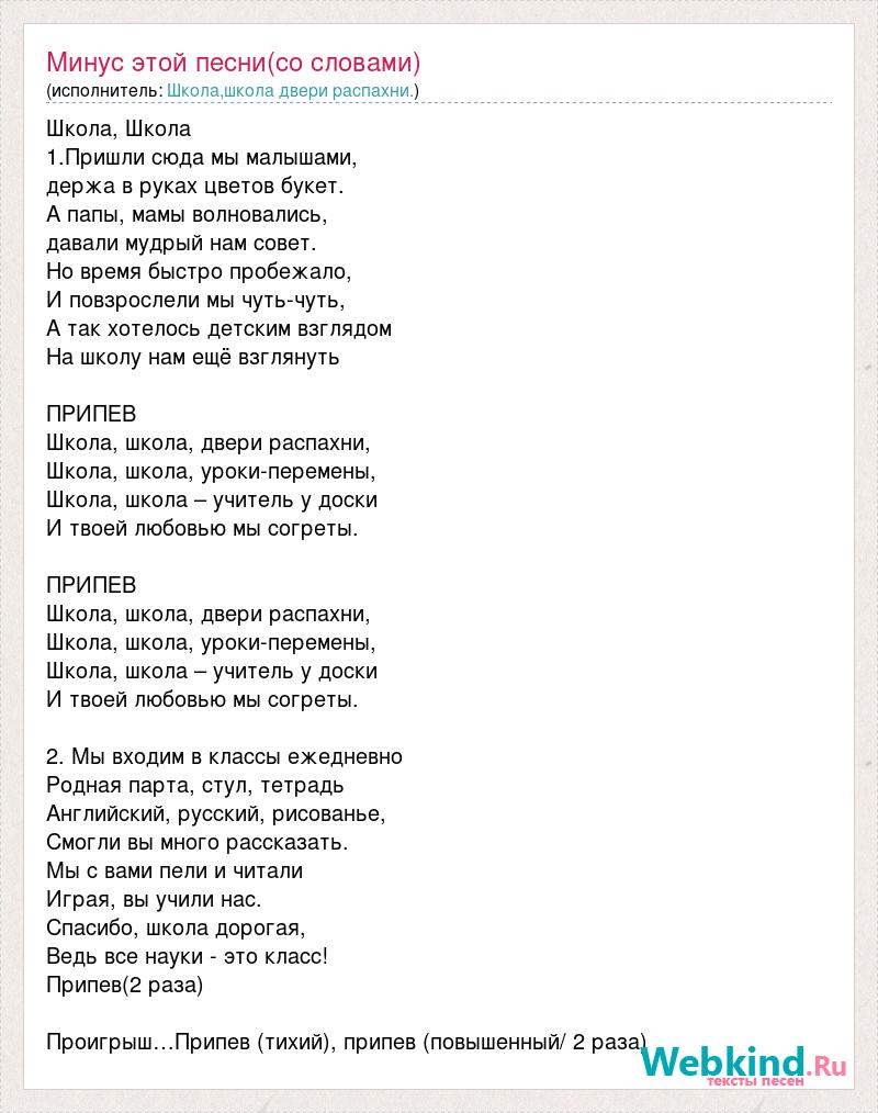Школа, Школа 1.Пришли сюда мы малышами, держа в руках цветов букет. А папы, мамы волновались, давали мудрый нам совет. Но время быстро пробежало, И повзрослели мы чуть-чуть, А так хотелось детским взглядом На школу нам ещё взглянуть ПРИПЕВ Школа, школа, двери распахни, Школа, школа, уроки-перемены, Школа, школа – учитель у доски И твоей любовью мы согреты. ПРИПЕВ Школа, школа, двери распахни, Школа, школа, уроки-перемены, Школа, школа – учитель у доски И твоей любовью мы согреты. 2. Мы входим в классы ежедневно Родная парта, стул, тетрадь Английский, русский, рисованье, Смогли вы много рассказать. Мы с вами пели и читали Играя, вы учили нас. Спасибо, школа дорогая, Ведь все науки - это класс! Припев(2 раза) Проигрыш…Припев (тихий), припев (повышенный/ 2 раза)