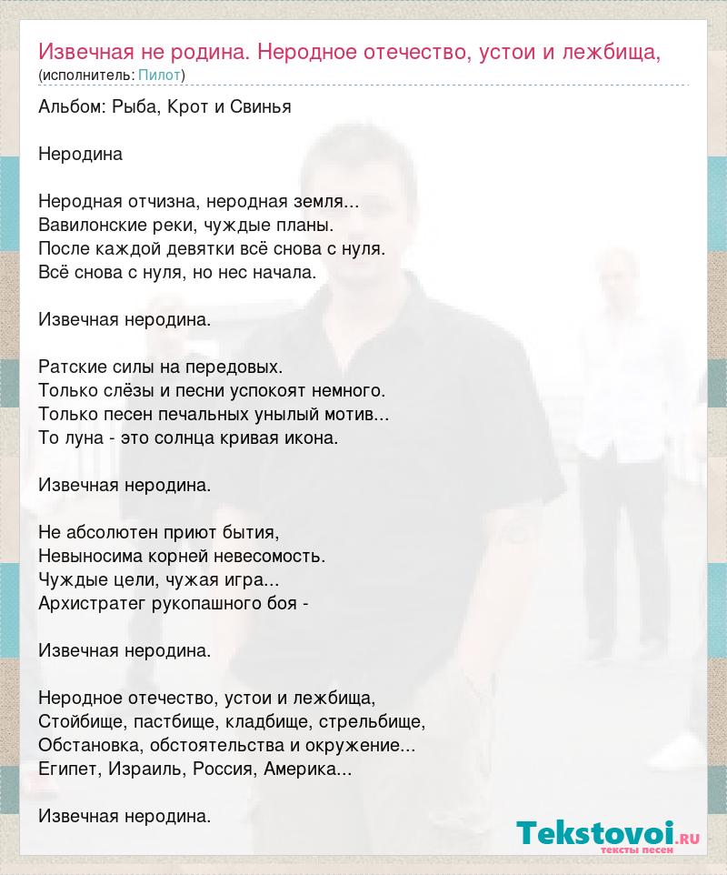 Альбом: Рыба, Крот и Свинья Неродина Неродная отчизна, неродная земля... Вавилонские реки, чуждые планы. После каждой девятки всё снова с нуля. Всё снова с нуля, но нес начала. Извечная неродина. Ратские силы на передовых. Только слёзы и песни успокоят немного. Только песен печальных унылый мотив... То луна - это солнца кривая икона. Извечная неродина. Не абсолютен приют бытия, Невыносима корней невесомость. Чуждые цели, чужая игра... Архистратег рукопашного боя - Извечная неродина. Неродное отечество, устои и лежбища, Стойбище, пастбище, кладбище, стрельбище, Обстановка, обстоятельства и окружение... Египет, Израиль, Россия, Америка... Извечная неродина.
