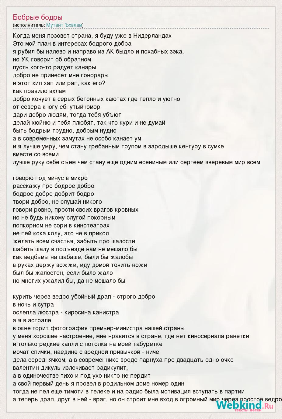 Когда меня позовет страна, я буду уже в Нидерландах Это мой план в интересах бодрого добра я рубил бы налево и направо из АК быдло и похабных зэка, но УК говорит об обратном пусть кого-то радует канары добро не принесет мне гонорары и этот хип хап или рап, как его? как правило вхлам добро кочует в серых бетонных каютах где тепло и уютно от севера к югу ебнутый юмор дари добро людям, тогда тебя убъют делай хюйню и тебя плюбят, так что кури и не думай быть бодрым трудно, добрым нудно а в современных замутах не особо канает ум и я лучше умру, чем стану гребанным трупом в зародыше кенгуру в сумке вместе со всеми лучше руку себе съем чем стану еще одним есениным или сергеем зверевым мир всем говорю под минус в микро расскажу про бодрое добро бодрое добро добрит бодро твори добро, не слушай никого говори ровно, прости своих врагов кровных но не будь никому слугой покорным попкорном не сори в кинотеатрах не пей кока колу, это не в прикол желать всем счастья, забыть про шалости шабить шалу в подъезде нам не мешало бы как ведбьмы на шабаше, были бы жалобы в руках держу вожжи, иду домой точить ножи был бы жалостен, если было жало но многих ужалил бы, да не мешало бы курить через ведро убойный драп - строго добро в ночь и сутра ослепла люстра - киросина канистра а я в астрале в окне горит фотография премьер-министра нашей страны у меня хорошее настроение, мне нравится в стране, где нет киносериала ранетки и только редкие капли с потолка на моей табуретке мочат спички, наедине с вредной привычкой - ниче дела середнячком, а в современнике вроде парнуха про двадцать одно очко валентин дикуль излечивает радикулит, а в одиночестве тихо и под ухо никто не пердит а свой первый день я провел в родильном доме номер один тогда не пел еще тимоти в телеке и на радио была мотивация вступать в партии а теперь драп. друг в ней - враг, но он строит мне вход в огромный мир через простое ведро