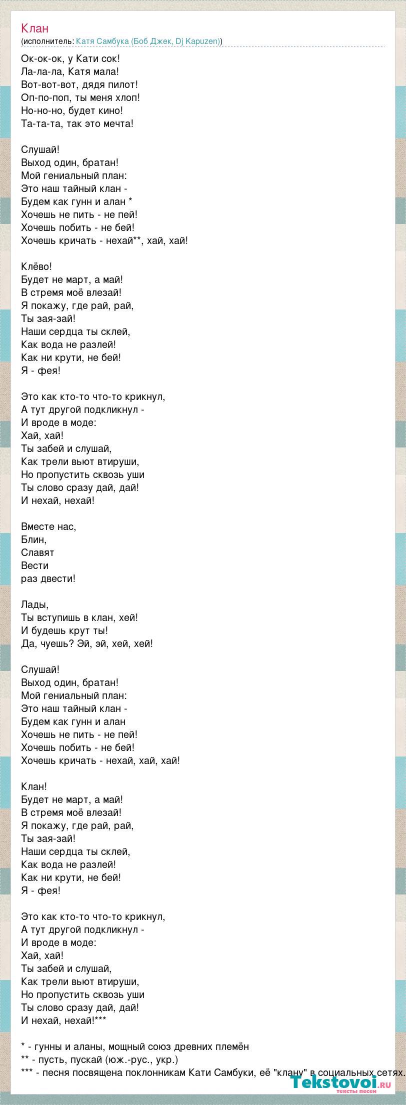Oк-oк-ок, у Кати сок! Ла-ла-ла, Катя мала! Вот-вот-вот, дядя пилот! Оп-по-поп, ты меня хлоп! Но-но-но, будет кино! Та-та-та, так это мечта! Слушай! Выход один, братан! Мой гениальный план: Это наш тайный клан - Будем как гунн и алан * Хочешь не пить - не пей! Хочешь побить - не бей! Хочешь кричать - нехай**, хай, хай! Клёво! Будет не март, а май! В стремя моё влезай! Я покажу, где рай, рай, Ты зая-зай! Наши сердца ты склей, Как вода не разлей! Как ни крути, не бей! Я - фея! Это как кто-то что-то крикнул, А тут другой подкликнул - И вроде в моде: Хай, хай! Ты забей и слушай, Как трели вьют втируши, Но пропустить сквозь уши Ты слово сразу дай, дай! И нехай, нехай! Вместе нас, Блин, Славят Вести раз двести! Лады, Ты вступишь в клан, хей! И будешь крут ты! Да, чуешь? Эй, эй, хей, хей! Слушай! Выход один, братан! Мой гениальный план: Это наш тайный клан - Будем как гунн и алан Хочешь не пить - не пей! Хочешь побить - не бей! Хочешь кричать - нехай, хай, хай! Клан! Будет не март, а май! В стремя моё влезай! Я покажу, где рай, рай, Ты зая-зай! Наши сердца ты склей, Как вода не разлей! Как ни крути, не бей! Я - фея! Это как кто-то что-то крикнул, А тут другой подкликнул - И вроде в моде: Хай, хай! Ты забей и слушай, Как трели вьют втируши, Но пропустить сквозь уши Ты слово сразу дай, дай! И нехай, нехай!*** * - гунны и аланы, мощный союз древних племён ** - пусть, пускай (юж.-рус., укр.) *** - песня посвящена поклонникам Кати Самбуки, её "клану" в социальных сетях.