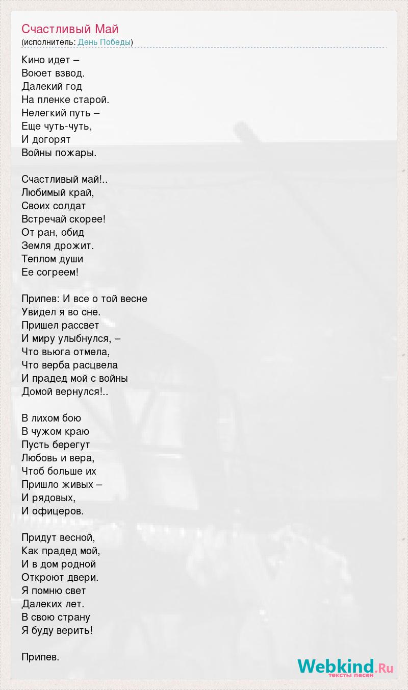 Кино идет – Воюет взвод. Далекий год На пленке старой. Нелегкий путь – Еще чуть-чуть, И догорят Войны пожары. Счастливый май!.. Любимый край, Своих солдат Встречай скорее! От ран, обид Земля дрожит. Теплом души Ее согреем! Припев: И все о той весне Увидел я во сне. Пришел рассвет И миру улыбнулся, – Что вьюга отмела, Что верба расцвела И прадед мой с войны Домой вернулся!.. В лихом бою В чужом краю Пусть берегут Любовь и вера, Чтоб больше их Пришло живых – И рядовых, И офицеров. Придут весной, Как прадед мой, И в дом родной Откроют двери. Я помню свет Далеких лет. В свою страну Я буду верить! Припев.