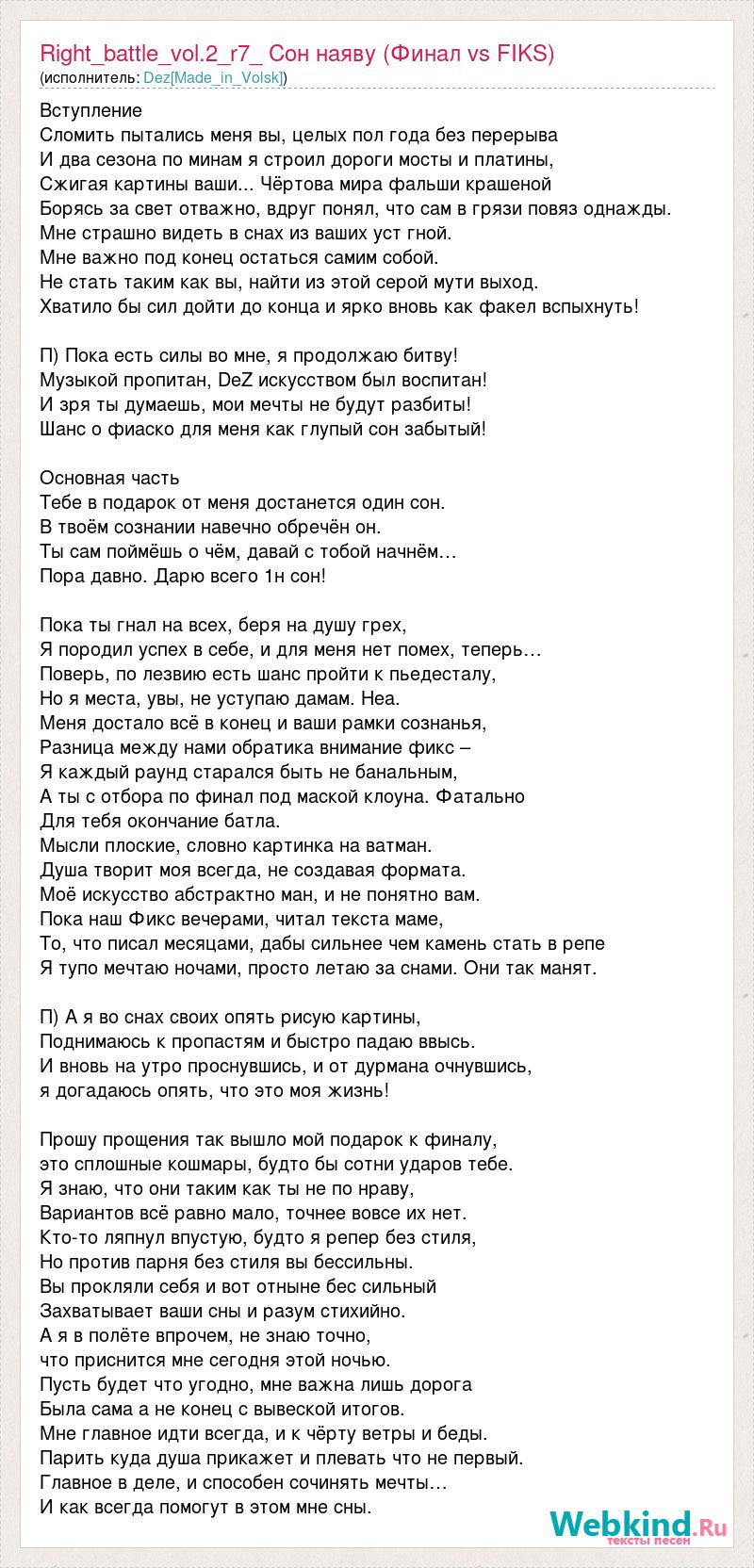 Вступление Сломить пытались меня вы, целых пол года без перерыва И два сезона по минам я строил дороги мосты и платины, Сжигая картины ваши... Чёртова мира фальши крашеной Борясь за свет отважно, вдруг понял, что сам в грязи повяз однажды. Мне страшно видеть в снах из ваших уст гной. Мне важно под конец остаться самим собой. Не стать таким как вы, найти из этой серой мути выход. Хватило бы сил дойти до конца и ярко вновь как факел вспыхнуть! П) Пока есть силы во мне, я продолжаю битву! Музыкой пропитан, DeZ искусством был воспитан! И зря ты думаешь, мои мечты не будут разбиты! Шанс о фиаско для меня как глупый сон забытый! Основная часть Тебе в подарок от меня достанется один сон. В твоём сознании навечно обречён он. Ты сам поймёшь о чём, давай с тобой начнём… Пора давно. Дарю всего 1н сон! Пока ты гнал на всех, беря на душу грех, Я породил успех в себе, и для меня нет помех, теперь… Поверь, по лезвию есть шанс пройти к пьедесталу, Но я места, увы, не уступаю дамам. Неа. Меня достало всё в конец и ваши рамки сознанья, Разница между нами обратика внимание фикс – Я каждый раунд старался быть не банальным, А ты с отбора по финал под маской клоуна. Фатально Для тебя окончание батла. Мысли плоские, словно картинка на ватман. Душа творит моя всегда, не создавая формата. Моё искусство абстрактно ман, и не понятно вам. Пока наш Фикс вечерами, читал текста маме, То, что писал месяцами, дабы сильнее чем камень стать в репе Я тупо мечтаю ночами, просто летаю за снами. Они так манят. П) А я во снах своих опять рисую картины, Поднимаюсь к пропастям и быстро падаю ввысь. И вновь на утро проснувшись, и от дурмана очнувшись, я догадаюсь опять, что это моя жизнь! Прошу прощения так вышло мой подарок к финалу, это сплошные кошмары, будто бы сотни ударов тебе. Я знаю, что они таким как ты не по нраву, Вариантов всё равно мало, точнее вовсе их нет. Кто-то ляпнул впустую, будто я репер без стиля, Но против парня без стиля вы бессильны. Вы прокляли себя и вот отныне бес сильный Захватывает ваши сны и разум стихийно. А я в полёте впрочем, не знаю точно, что приснится мне сегодня этой ночью. Пусть будет что угодно, мне важна лишь дорога Была сама а не конец с вывеской итогов. Мне главное идти всегда, и к чёрту ветры и беды. Парить куда душа прикажет и плевать что не первый. Главное в деле, и способен сочинять мечты… И как всегда помогут в этом мне сны.