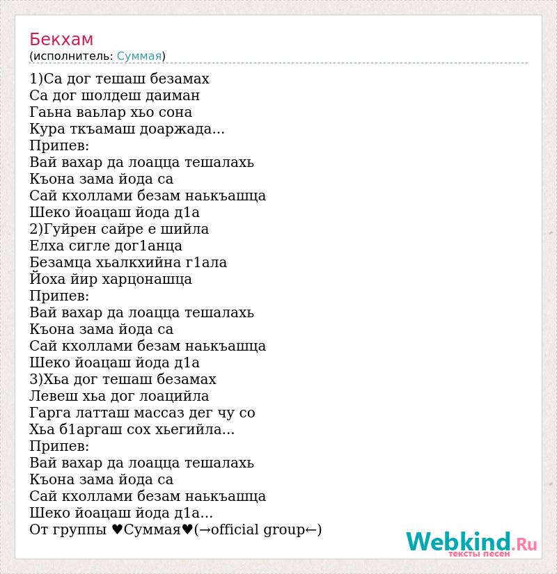 1)Са дог тешаш безамах Са дог шолдеш даиман Гаьна ваьлар хьо сона Кура ткъамаш доаржада... Припев: Вай вахар да лоацца тешалахь Къона зама йода са Сай кхоллами безам наькъашца Шеко йоацаш йода д1а 2)Гуйрен сайре е шийла Елха сигле дог1анца Безамца хьалкхийна г1ала Йоха йир харцонашца Припев: Вай вахар да лоацца тешалахь Къона зама йода са Сай кхоллами безам наькъашца Шеко йоацаш йода д1а 3)Хьа дог тешаш безамах Левеш хьа дог лоацийла Гарга латташ массаз дег чу со Хьа б1аргаш сох хьегийла... Припев: Вай вахар да лоацца тешалахь Къона зама йода са Сай кхоллами безам наькъашца Шеко йоацаш йода д1а... От группы ♥Суммая♥(→official grоup←)