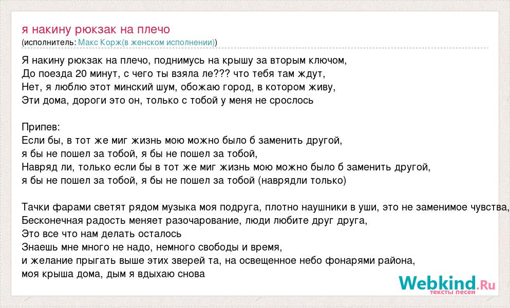 Я накину рюкзак на плечо, поднимусь на крышу за вторым ключом, До поезда 20 минут, с чего ты взяла ле??? что тебя там ждут, Нет, я люблю этот минский шум, обожаю город, в котором живу, Эти дома, дороги это он, только с тобой у меня не срослось Припев: Если бы, в тот же миг жизнь мою можно было б заменить другой, я бы не пошел за тобой, я бы не пошел за тобой, Навряд ли, только если бы в тот же миг жизнь мою можно было б заменить другой, я бы не пошел за тобой, я бы не пошел за тобой (наврядли только) Тачки фарами светят рядом музыка моя подруга, плотно наушники в уши, это не заменимое чувства, Бесконечная радость меняет разочарование, люди любите друг друга, Это все что нам делать осталось Знаешь мне много не надо, немного свободы и время, и желание прыгать выше этих зверей та, на освещенное небо фонарями района, моя крыша дома, дым я вдыхаю снова