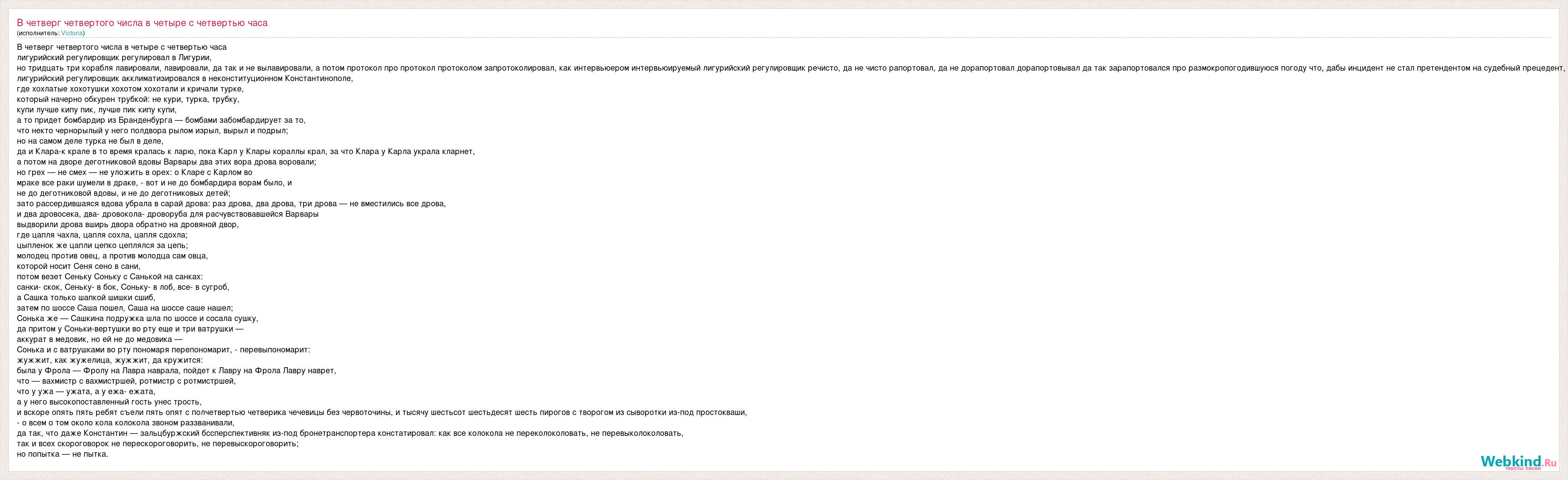 В четверг четвертого числа в четыре с четвертью часа лигурийский регулировщик регулировал в Лигурии, но тридцать три корабля лавировали, лавировали, да так и не вылавировали, а потом протокол про протокол протоколом запротоколировал, как интервьюером интервьюируемый лигурийский регулировщик речисто, да не чисто рапортовал, да не дорапортовал дорапортовывал да так зарапортовался про размокропогодившуюся погоду что, дабы инцидент не стал претендентом на судебный прецедент, лигурийский регулировщик акклиматизировался в неконституционном Константинополе, где хохлатые хохотушки хохотом хохотали и кричали турке, который начерно обкурен трубкой: не кури, турка, трубку, купи лучше кипу пик, лучше пик кипу купи, а то придет бомбардир из Бранденбурга — бомбами забомбардирует за то, что некто чернорылый у него полдвора рылом изрыл, вырыл и подрыл; но на самом деле турка не был в деле, да и Клара-к крале в то время кралась к ларю, пока Карл у Клары кораллы крал, за что Клара у Карла украла кларнет, а потом на дворе деготниковой вдовы Варвары два этих вора дрова воровали; но грех — не смех — не уложить в орех: о Кларе с Карлом во мраке все раки шумели в драке, - вот и не до бомбардира ворам было, и не до деготниковой вдовы, и не до деготниковых детей; зато рассердившаяся вдова убрала в сарай дрова: раз дрова, два дрова, три дрова — не вместились все дрова, и два дровосека, два- дровокола- дроворуба для расчувствовавшейся Варвары выдворили дрова вширь двора обратно на дровяной двор, где цапля чахла, цапля сохла, цапля сдохла; цыпленок же цапли цепко цеплялся за цепь; молодец против овец, а против молодца сам овца, которой носит Сеня сено в сани, потом везет Сеньку Соньку с Санькой на санках: санки- скок, Сеньку- в бок, Соньку- в лоб, все- в сугроб, а Сашка только шапкой шишки сшиб, затем по шоссе Саша пошел, Саша на шоссе саше нашел; Сонька же — Сашкина подружка шла по шоссе и сосала сушку, да притом у Соньки-вертушки во рту еще и три ватрушки — аккурат в медовик, но ей не до медовика — Сонька и с ватрушками во рту пономаря перепономарит, - перевыпономарит: жужжит, как жужелица, жужжит, да кружится: была у Фрола — Фролу на Лавра наврала, пойдет к Лавру на Фрола Лавру наврет, что — вахмистр с вахмистршей, ротмистр с ротмистршей, что у ужа — ужата, а у ежа- ежата, а у него высокопоставленный гость унес трость, и вскоре опять пять ребят съели пять опят с полчетвертью четверика чечевицы без червоточины, и тысячу шестьсот шестьдесят шесть пирогов с творогом из сыворотки из-под простокваши, - о всем о том около кола колокола звоном раззванивали, да так, что даже Константин — зальцбуржский бссперспективняк из-под бронетранспортера констатировал: как все колокола не переколоколовать, не перевыколоколовать, так и всех скороговорок не перескороговорить, не перевыскороговорить; но попытка — не пытка.