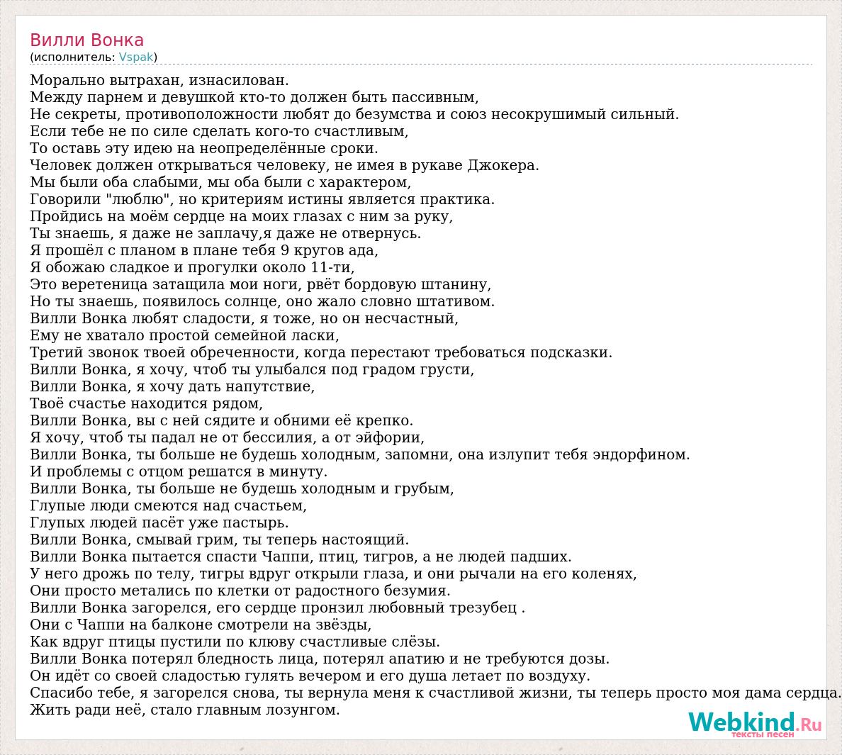 Морально вытрахан, изнасилован. Между парнем и девушкой кто-то должен быть пассивным, Не секреты, противоположности любят до безумства и союз несокрушимый сильный. Если тебе не по силе сделать кого-то счастливым, То оставь эту идею на неопределённые сроки. Человек должен открываться человеку, не имея в рукаве Джокера. Мы были оба слабыми, мы оба были с характером, Говорили "люблю", но критериям истины является практика. Пройдись на моём сердце на моих глазах с ним за руку, Ты знаешь, я даже не заплачу,я даже не отвернусь. Я прошёл с планом в плане тебя 9 кругов ада, Я обожаю сладкое и прогулки около 11-ти, Это веретеница затащила мои ноги, рвёт бордовую штанину, Но ты знаешь, появилось солнце, оно жало словно штативом. Вилли Вонка любят сладости, я тоже, но он несчастный, Ему не хватало простой семейной ласки, Третий звонок твоей обреченности, когда перестают требоваться подсказки. Вилли Вонка, я хочу, чтоб ты улыбался под градом грусти, Вилли Вонка, я хочу дать напутствие, Твоё счастье находится рядом, Вилли Вонка, вы с ней сядите и обними её крепко. Я хочу, чтоб ты падал не от бессилия, а от эйфории, Вилли Вонка, ты больше не будешь холодным, запомни, она излупит тебя эндорфином. И проблемы с отцом решатся в минуту. Вилли Вонка, ты больше не будешь холодным и грубым, Глупые люди смеются над счастьем, Глупых людей пасёт уже пастырь. Вилли Вонка, смывай грим, ты теперь настоящий. Вилли Вонка пытается спасти Чаппи, птиц, тигров, а не людей падших. У него дрожь по телу, тигры вдруг открыли глаза, и они рычали на его коленях, Они просто метались по клетки от радостного безумия. Вилли Вонка загорелся, его сердце пронзил любовный трезубец . Они с Чаппи на балконе смотрели на звёзды, Как вдруг птицы пустили по клюву счастливые слёзы. Вилли Вонка потерял бледность лица, потерял апатию и не требуются дозы. Он идёт со своей сладостью гулять вечером и его душа летает по воздуху. Спасибо тебе, я загорелся снова, ты вернула меня к счастливой жизни, ты теперь просто моя дама сердца. Жить ради неё, стало главным лозунгом.