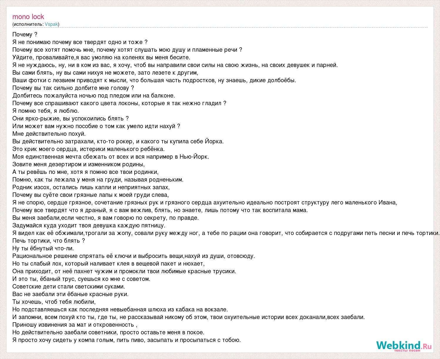 Почему ? Я не понимаю почему все твердят одно и тоже ? Почему все хотят помочь мне, почему хотят слушать мою душу и пламенные речи ? Уйдите, проваливайте,я вас умоляю на коленях вы меня бесите. Я не нуждаюсь, ну, ни в ком из вас, я хочу, чтоб вы направили свои силы на свою жизнь, на своих девушек и парней. Вы сами блять, ну вы сами нихуя не можете, зато лезете к другим, Ваши фотки с лезвием приводят к мысли, что большая часть подростков, ну знаешь, дикие долбоёбы. Почему вы так сильно долбите мне голову ? Долбитесь пожалуйста ночью под пледом или на балконе. Почему все спрашивают какого цвета локоны, которые я так нежно гладил ? Я помню тебя, я люблю. Они ярко-рыжие, вы успокоились блять ? Или может вам нужно пособие о том как умело идти нахуй ? Мне действительно похуй. Вы действительно затрахали, кто-то рокер, и какого ты купила себе Йорка. Это крик моего сердца, истерики маленького ребёнка. Моя единственная мечта сбежать от всех и вся например в Нью-Йорк. Зовите меня дезертиром и изменником родины, А ты ревёшь по мне, хотя я помню все твои родинки, Помню, как ты лежала у меня на груди, называя родненьким. Родник изсох, остались лишь капли и неприятных запах, Почему вы суёте свои грязные лапы к моей груди слева, Я не спорю, сердце грязное, сочетание грязных рук и грязного сердца ахуительно идеально построят структуру лего маленького Ивана, Почему все твердят что я драный, я с вам вежлив, блять, но знаете, лишь потому что так воспитала мама. Вы меня заебали,если честно, я вам говорю по секрету, по правде. Задумайся куда уходит твоя девушка каждую пятницу. Я видел как её обжимали,трогали за жопу, совали руку между ног, а тебе по рации она говорит, что собирается с подругами петь песни и печь тортики. Печь тортики, что блять ? Ну ты ёбнутый что-ли. Рациональное решение спрятать её ключи и выбросить вещи,нахуй из души, отовсюду. Но ты слабый лох, который наливает клея в вещевой пакет и нюхает, Она приходит, от неё пахнет чужим и промокли твои любимые красные трусики. И это ты, ёбаный трус, суешься ко мне с советом. Советские дети стали светскими суками. Вас не заебали эти ёбаные красные руки. Ты хочешь, чтоб тебя любили, Но подставляешься как последняя невыебанная шлюха из кабака на вокзале. И запомни, всем похуй кто ты, где ты, не рассказывай никому об этом, твои охуительные истории всех доканали,всех заебали. Приношу извинения за мат и откровенность , Но действительно заебали советники, просто оставьте меня в покое. Я просто хочу сидеть у компа голым, пить пиво, засыпать и просыпаться с тобою.