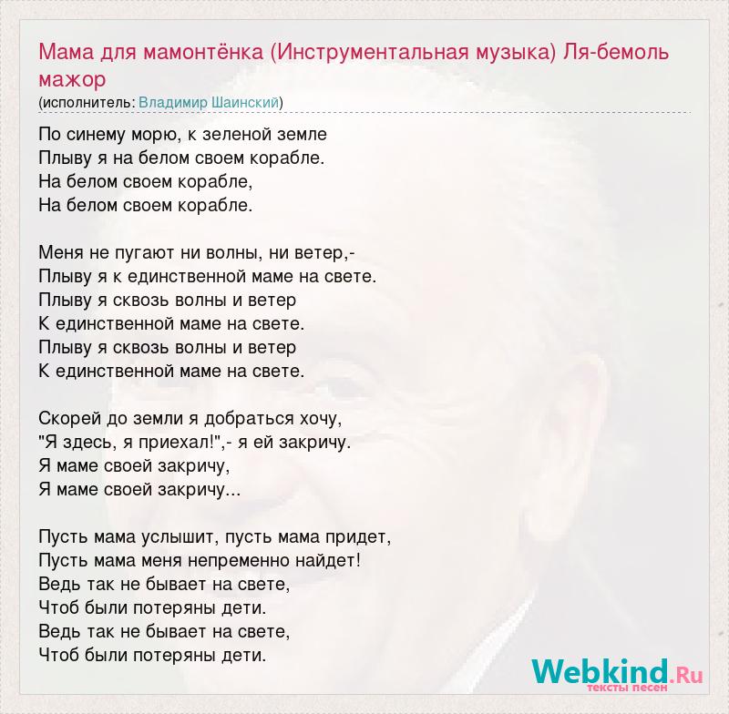 По синему морю, к зеленой земле Плыву я на белом своем корабле. На белом своем корабле, На белом своем корабле. Меня не пугают ни волны, ни ветер,- Плыву я к единственной маме на свете. Плыву я сквозь волны и ветер К единственной маме на свете. Плыву я сквозь волны и ветер К единственной маме на свете. Скорей до земли я добраться хочу, "Я здесь, я приехал!",- я ей закричу. Я маме своей закричу, Я маме своей закричу... Пусть мама услышит, пусть мама придет, Пусть мама меня непременно найдет! Ведь так не бывает на свете, Чтоб были потеряны дети. Ведь так не бывает на свете, Чтоб были потеряны дети.