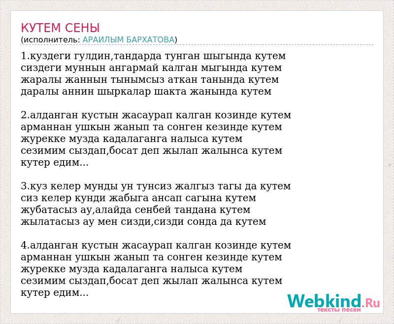 1.куздеги гулдин,тандарда тунган шыгында кутем сиздеги муннын ангармай калган мыгында кутем жаралы жаннын тынымсыз аткан танында кутем даралы аннин шыркалар шакта жанында кутем 2.алданган кустын жасаурап калган козинде кутем арманнан ушкын жанып та сонген кезинде кутем журекке музда кадалаганга налыса кутем сезимим сыздап,босат деп жылап жалынса кутем кутер едим... 3.куз келер мунды ун тунсиз жалгыз тагы да кутем сиз келер кунди жабыга ансап сагына кутем жубатасыз ау,алайда сенбей тандана кутем жылатасыз ау мен сизди,сизди сонда да кутем 4.алданган кустын жасаурап калган козинде кутем арманнан ушкын жанып та сонген кезинде кутем журекке музда кадалаганга налыса кутем сезимим сыздап,босат деп жылап жалынса кутем кутер едим...