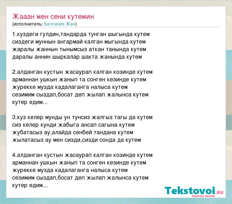 1.куздеги гулдин,тандарда тунган шыгында кутем сиздеги муннын ангармай калган мыгында кутем жаралы жаннын тынымсыз аткан танында кутем даралы аннин шыркалар шакта жанында кутем 2.алданган кустын жасаурап калган козинде кутем арманнан ушкын жанып та сонген кезинде кутем журекке музда кадалаганга налыса кутем сезимим сыздап,босат деп жылап жалынса кутем кутер едим... 3.куз келер мунды ун тунсиз жалгыз тагы да кутем сиз келер кунди жабыга ансап сагына кутем жубатасыз ау,алайда сенбей тандана кутем жылатасыз ау мен сизди,сизди сонда да кутем 4.алданган кустын жасаурап калган козинде кутем арманнан ушкын жанып та сонген кезинде кутем журекке музда кадалаганга налыса кутем сезимим сыздап,босат деп жылап жалынса кутем кутер едим...