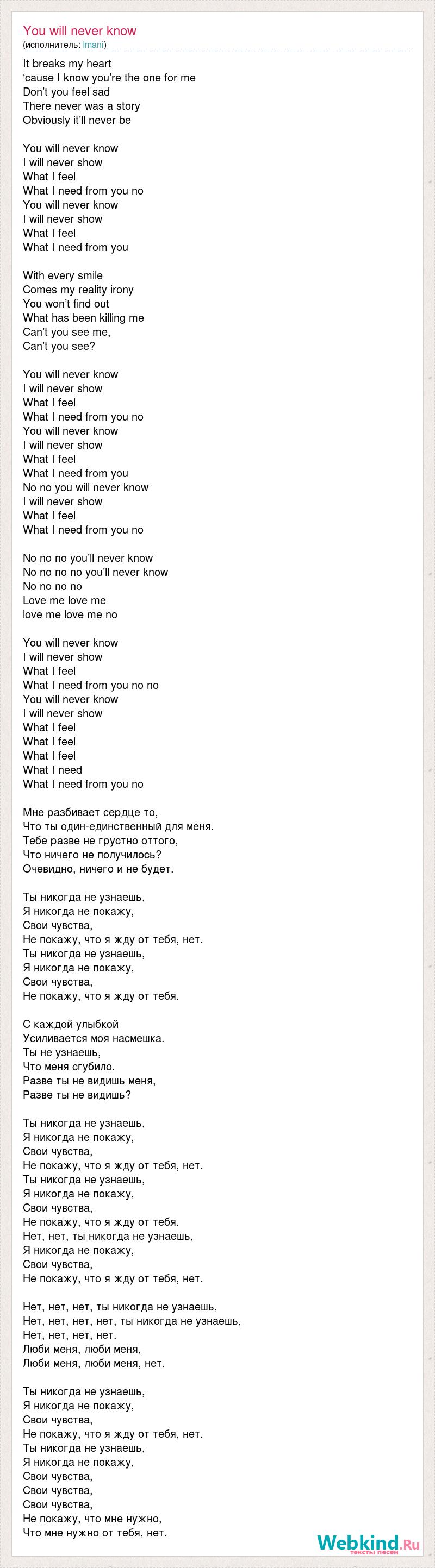 It breaks my heart ‘cause I know you’re the one for me Don’t you feel sad There never was a story Obviously it’ll never be You will never know I will never show What I feel What I need from you no You will never know I will never show What I feel What I need from you With every smile Comes my reality irony You won’t find out What has been killing me Can’t you see me, Can’t you see? You will never know I will never show What I feel What I need from you no You will never know I will never show What I feel What I need from you No no you will never know I will never show What I feel What I need from you no No no no you’ll never know No no no no you’ll never know No no no no Love me love me love me love me no You will never know I will never show What I feel What I need from you no no You will never know I will never show What I feel What I feel What I feel What I need What I need from you no Мне разбивает сердце то, Что ты один-единственный для меня. Тебе разве не грустно оттого, Что ничего не получилось? Очевидно, ничего и не будет. Ты никогда не узнаешь, Я никогда не покажу, Свои чувства, Не покажу, что я жду от тебя, нет. Ты никогда не узнаешь, Я никогда не покажу, Свои чувства, Не покажу, что я жду от тебя. С каждой улыбкой Усиливается моя насмешка. Ты не узнаешь, Что меня сгубило. Разве ты не видишь меня, Разве ты не видишь? Ты никогда не узнаешь, Я никогда не покажу, Свои чувства, Не покажу, что я жду от тебя, нет. Ты никогда не узнаешь, Я никогда не покажу, Свои чувства, Не покажу, что я жду от тебя. Нет, нет, ты никогда не узнаешь, Я никогда не покажу, Свои чувства, Не покажу, что я жду от тебя, нет. Нет, нет, нет, ты никогда не узнаешь, Нет, нет, нет, нет, ты никогда не узнаешь, Нет, нет, нет, нет. Люби меня, люби меня, Люби меня, люби меня, нет. Ты никогда не узнаешь, Я никогда не покажу, Свои чувства, Не покажу, что я жду от тебя, нет. Ты никогда не узнаешь, Я никогда не покажу, Свои чувства, Свои чувства, Свои чувства, Не покажу, что мне нужно, Что мне нужно от тебя, нет.
