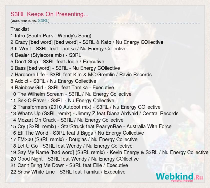 Tracklist 1 Intro (South Park - Wendy's Song) 2 Crazy [bad word] [bad word] - S3RL & Kato / Nu Energy COllective 3 It Went - S3RL feat Tamika / Nu Energy Collective 4 Dealer (Stylecore mix) - S3RL 5 Don't Stop - S3RL feat Jodie / Executive 6 Bass [bad word] - S3RL - Nu Energy COllective 7 Hardcore Life - S3RL feat Kim & MC Gremlin / Ravin Records 8 Addict - S3RL / Nu Energy Collective 9 Rainbow Girl - S3RL feat Tamika - Executive 10 The Wilhelm Scream - S3RL / Nu Energy Collective 11 Sek-C-Raver - S3RL - Nu Energy Collective 12 Transformers (2010 Autobot mix) - S3RL / Nu Energy COllective 13 What's Up (S3RL remix) - Jimmy Z feat Diana Ah'Naid / Central Records 14 Mozart On Crack - S3RL / Nu Energy Collective 15 Cry (S3RL remix) - StarStruck feat PearlynRae - Australia With Force 16 Eff The World - S3RL feat J Bigga / Nu Energy Collective 17 FM200 (S3RL remix) - Douglas / Nu Energy Collective 18 Let U Go - S3RL feat Wendy / Nu Energy Collective 19 Say My Name [bad word] (S3RL remix) - Kevin Energy & S3RL / Nu Energy Collective 20 Good Night - S3RL feat Wendy / Nu Energy COllective 21 Can't Bring Me Down - S3RL feat Ellie / Executive 22 Snow White Line - S3RL feat Tamika / Executive