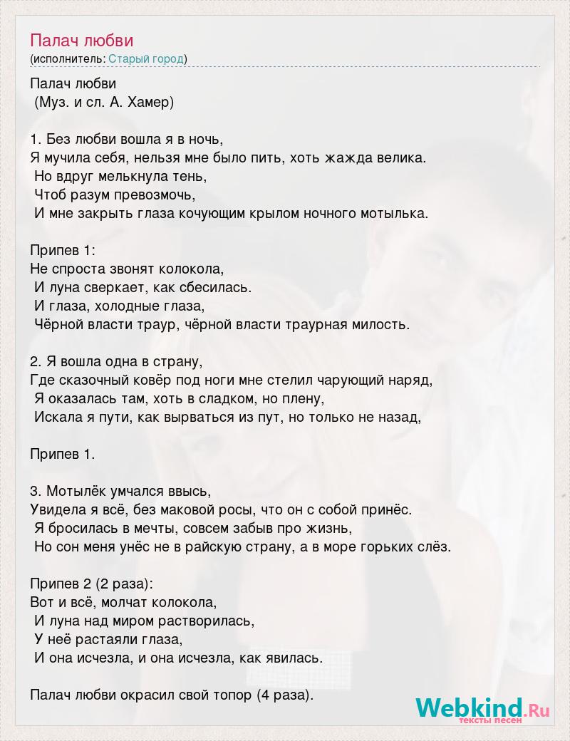 Палач любви (Муз. и сл. А. Хамер) 1. Без любви вошла я в ночь, Я мучила себя, нельзя мне было пить, хоть жажда велика. Но вдруг мелькнула тень, Чтоб разум превозмочь, И мне закрыть глаза кочующим крылом ночного мотылька. Припев 1: Не спроста звонят колокола, И луна сверкает, как сбесилась. И глаза, холодные глаза, Чёрной власти траур, чёрной власти траурная милость. 2. Я вошла одна в страну, Где сказочный ковёр под ноги мне стелил чарующий наряд, Я оказалась там, хоть в сладком, но плену, Искала я пути, как вырваться из пут, но только не назад, Припев 1. 3. Мотылёк умчался ввысь, Увидела я всё, без маковой росы, что он с собой принёс. Я бросилась в мечты, совсем забыв про жизнь, Но сон меня унёс не в райскую страну, а в море горьких слёз. Припев 2 (2 раза): Вот и всё, молчат колокола, И луна над миром растворилась, У неё растаяли глаза, И она исчезла, и она исчезла, как явилась. Палач любви окрасил свой топор (4 раза).
