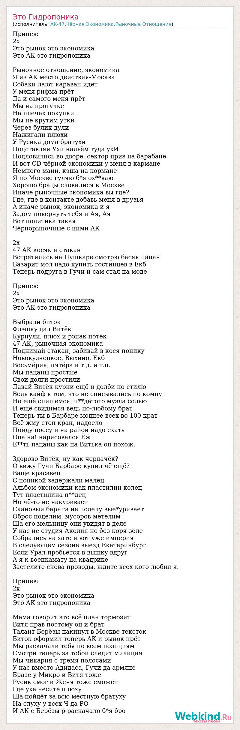 Припев: 2х Это рынок это экономика Это АК это гидропоника Рыночное отношение, экономика Я из АК место действия-Москва Собаки лают караван идёт У меня рифма прёт Да и самого меня прёт Мы на прогулке На плечах покупки Мы не крутим утки Через булик дули Нажигали плюхи У Русика дома братухи Подставляй Ухи нальём туда ухИ Подловились во дворе, сектор приз на барабане И вот CD чёрной экономики у меня в кармане Немного мани, кэша на кормане Я по Москве гуляю б*я ох**ваю Хорошо брацы словилися в Москве Иначе рыночные экономика вы где? Где, где в контакте добавь меня в друзья А иначе рынок, экономика и я Задом повернуть тебя и Ая, Ая Вот политика такая Чёрнорыночные с ними АК 2х 47 АК косяк и стакан Встретились на Пушкаре смотрю басяк пацан Базарит мол надо купить гостинцев в Екб Теперь подруга в Гучи и сам стал на моде Припев: 2х Это рынок это экономика Это АК это гидропоника Выбрали биток Флэшку дал Витёк Курнули, плюх и рэпак потёк 47 АК, рыночная экономика Поднимай стакан, забивай в кося понику Новокузнецкое, Выхино, Екб Восьмёрик, пятёра и т.д. и т.п. Мы пацаны простые Свои долги простили Давай Витёк курни ещё и долби по стилю Ведь кайф в том, что не списывались по компу Но ешё спишемся, п**датого музла солью И ещё свидимся ведь по-любому брат Теперь ты в Барбаре моднее всех во 100 крат Всё жму стоп кран, надоело Пойду поссу и на район надо ехать Опа на! нарисовался Ёж Е**ть пацаны как на Витька он похож. Здорово Витёк, ну как чердачёк? О вижу Гучи Барбаре купил чё ещё? Ваще красавец С поникой задержали малец Альбом экономики как пластилин колец Тут пластилина п**дец Но чё-то не накуривает Скановый барыга не поделу вые*уривает Оброс поделим, мусоров метелим Ща его мельницу они увидят в деле У нас не студия Акелия не без коря зеле Собрались на хате и вот уже империя В следующем сезоне выезд Екатеринбург Если Урал пробьётся в вышку вдруг А я к военкамату на квадрике Застелите снова проводы, ждите всех кого любил я. Припев: 2х Это рынок это экономика Это АК это гидропоника Мама говорит это всё план тормозит Витя прав поэтому он и брат Талант Берёзы накинул в Москве тексток Биток оформил теперь АК и рынок прёт Мы раскачали тебя по всем позициям Смотри теперь за тобой следит милиция Мы чикарня с тремя полосами У нас вместо Адидаса, Гучи да армяне Бразе у Микро и Витя тоже Русик смог и Женя тоже сможет Где уха несите плюху Ща пойдёт за всю местную братуху На слуху у всех Ч да РО И АК с Берёзы р-раскачало б*я бро