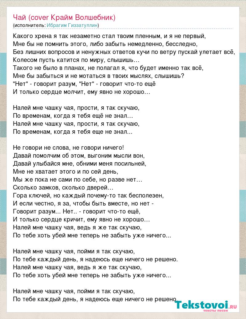 Какого хрена я так незаметно стал твоим пленным, и я не первый, Мне бы не помнить этого, либо забыть немедленно, бесследно, Без лишних вопросов и ненужных ответов кучи по ветру пускай улетает всё, Колесом пусть катится по миру, слышишь… Такого не было в планах, не полагал я, что будет именно так всё, Мне бы забыться и не мотаться в твоих мыслях, слышишь? "Нет" - говорит разум, "Нет" - говорит что-то ещё И только сердце молчит, ему явно не хорошо… Налей мне чашку чая, прости, я так скучаю, По временам, когда я тебя ещё не знал… Налей мне чашку чая, прости, я так скучаю, По временам, когда я тебя еще не знал... Не говори не слова, не говори ничего! Давай помолчим об этом, выгоним мысли вон, Давай улыбайся мне, обними меня посильней, Мне не хватает этого и по сей день, Мы же пока не сами по себе, но разве нет… Сколько замков, сколько дверей… Гора ключей, но каждый почему-то так бесполезен, И если честно, я за, чтобы быть вместе, но нет - Говорит разум... Нет.. - говорит что-то ещё, И только сердце кричит, ему явно не хорошо… Налей мне чашку чая, ведь я же так скучаю, По тебе хоть убей мне теперь не забыть уже ничего... Налей мне чашку чая, пойми я так скучаю, По тебе каждый день, я надеюсь еще ничего не решено. Налей мне чашку чая, ведь я же так скучаю, По тебе хоть убей мне теперь не забыть уже ничего... Налей мне чашку чая, пойми я так скучаю, По тебе каждый день, я надеюсь еще ничего не решено.