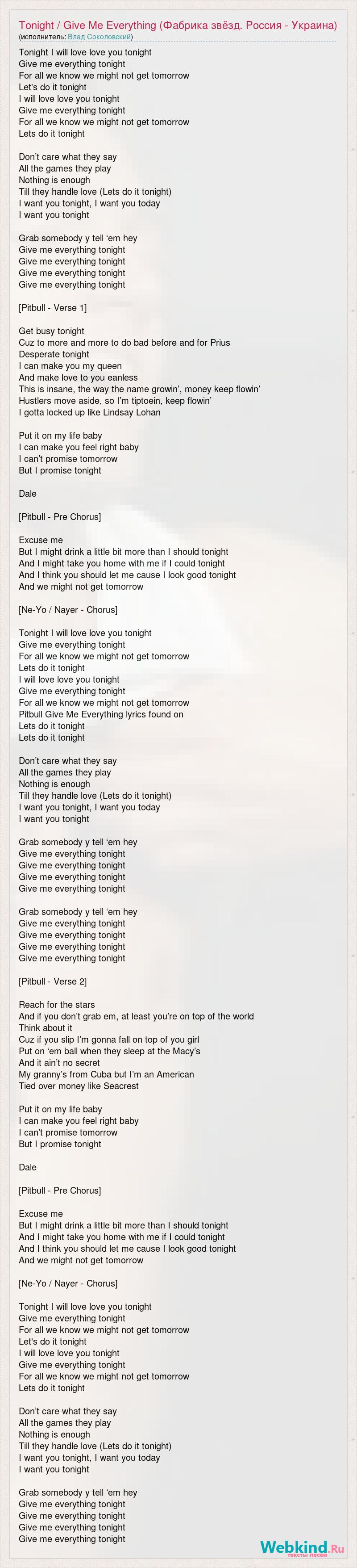 Tonight I will love love you tonight Give me everything tonight For all we know we might not get tomorrow Let's do it tonight I will love love you tonight Give me everything tonight For all we know we might not get tomorrow Lets do it tonight Don’t care what they say All the games they play Nothing is enough Till they handle love (Lets do it tonight) I want you tonight, I want you today I want you tonight Grab somebody y tell ‘em hey Give me everything tonight Give me everything tonight Give me everything tonight Give me everything tonight [Pitbull - Verse 1] Get busy tonight Cuz to more and more to do bad before and for Prius Desperate tonight I can make you my queen And make love to you eanless This is insane, the way the name growin’, money keep flowin’ Hustlers move aside, so I’m tiptoein, keep flowin’ I gotta locked up like Lindsay Lohan Put it on my life baby I can make you feel right baby I can’t promise tomorrow But I promise tonight Dale [Pitbull - Pre Chorus] Excuse me But I might drink a little bit more than I should tonight And I might take you home with me if I could tonight And I think you should let me cause I look good tonight And we might not get tomorrow [Ne-Yo / Nayer - Chorus] Tonight I will love love you tonight Give me everything tonight For all we know we might not get tomorrow Lets do it tonight I will love love you tonight Give me everything tonight For all we know we might not get tomorrow Pitbull Give Me Everything lyrics found on Lets do it tonight Lets do it tonight Don’t care what they say All the games they play Nothing is enough Till they handle love (Lets do it tonight) I want you tonight, I want you today I want you tonight Grab somebody y tell ‘em hey Give me everything tonight Give me everything tonight Give me everything tonight Give me everything tonight Grab somebody y tell ‘em hey Give me everything tonight Give me everything tonight Give me everything tonight Give me everything tonight [Pitbull - Verse 2] Reach for the stars And if you don’t grab em, at least you’re on top of the world Think about it Cuz if you slip I’m gonna fall on top of you girl Put on ‘em ball when they sleep at the Macy’s And it ain’t no secret My granny’s from Cuba but I’m an American Tied over money like Seacrest Put it on my life baby I can make you feel right baby I can’t promise tomorrow But I promise tonight Dale [Pitbull - Pre Chorus] Excuse me But I might drink a little bit more than I should tonight And I might take you home with me if I could tonight And I think you should let me cause I look good tonight And we might not get tomorrow [Ne-Yo / Nayer - Chorus] Tonight I will love love you tonight Give me everything tonight For all we know we might not get tomorrow Let's do it tonight I will love love you tonight Give me everything tonight For all we know we might not get tomorrow Lets do it tonight Don’t care what they say All the games they play Nothing is enough Till they handle love (Lets do it tonight) I want you tonight, I want you today I want you tonight Grab somebody y tell ‘em hey Give me everything tonight Give me everything tonight Give me everything tonight Give me everything tonight