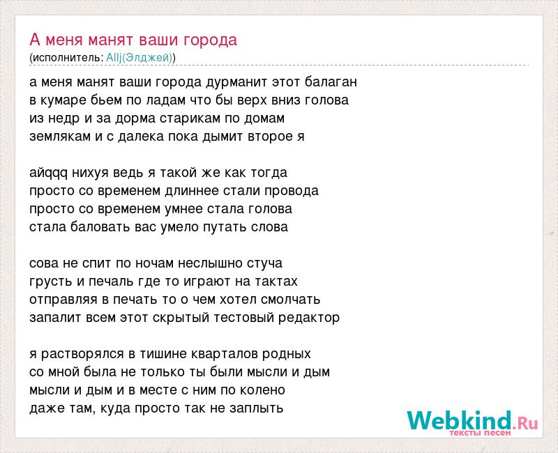 а меня манят ваши города дурманит этот балаган в кумаре бьем по ладам что бы верх вниз голова из недр и за дорма старикам по домам землякам и с далека пока дымит второе я айqqq нихуя ведь я такой же как тогда просто со временем длиннее стали провода просто со временем умнее стала голова стала баловать вас умело путать слова сова не спит по ночам неслышно стуча грусть и печаль где то играют на тактах отправляя в печать то о чем хотел смолчать запалит всем этот скрытый тестовый редактор я растворялся в тишине кварталов родных со мной была не только ты были мысли и дым мысли и дым и в месте с ним по колено даже там, куда просто так не заплыть