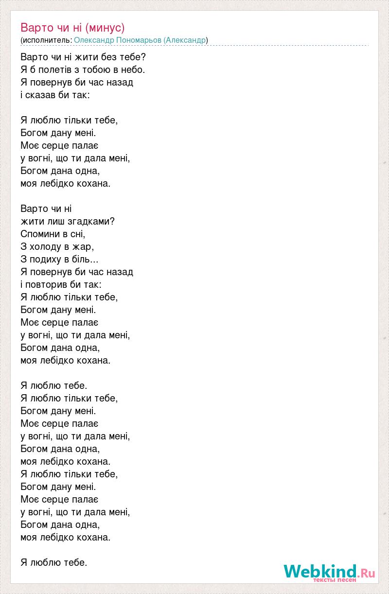 Варто чи ні жити без тебе? Я б полетів з тобою в небо. Я повернув би час назад і сказав би так: Я люблю тільки тебе, Богом дану мені. Моє серце палає у вогні, що ти дала мені, Богом дана одна, моя лебідко кохана. Варто чи ні жити лиш згадками? Спомини в сні, З холоду в жар, З подиху в біль... Я повернув би час назад і повторив би так: Я люблю тільки тебе, Богом дану мені. Моє серце палає у вогні, що ти дала мені, Богом дана одна, моя лебідко кохана. Я люблю тебе. Я люблю тільки тебе, Богом дану мені. Моє серце палає у вогні, що ти дала мені, Богом дана одна, моя лебідко кохана. Я люблю тільки тебе, Богом дану мені. Моє серце палає у вогні, що ти дала мені, Богом дана одна, моя лебідко кохана. Я люблю тебе.