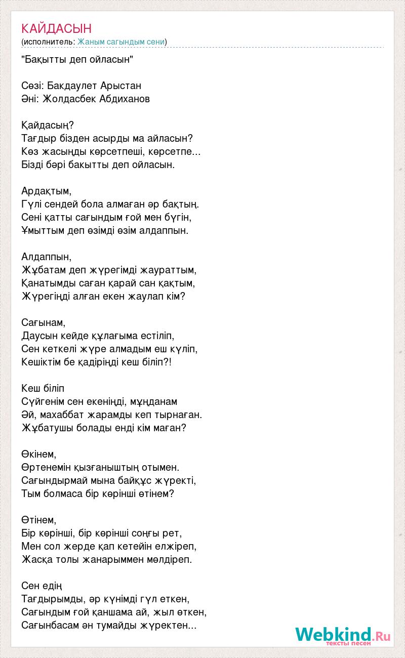 "Бақытты деп ойласын" Сөзі: Бакдаулет Арыстан Әні: Жолдасбек Абдиханов Қайдасың? Тағдыр бізден асырды ма айласын? Көз жасыңды көрсетпеші, көрсетпе... Бізді бәрі бакытты деп ойласын. Ардақтым, Гүлі сендей бола алмаған әр бақтың. Сені қатты сағындым ғой мен бүгін, Ұмыттым деп өзімді өзім алдаппын. Алдаппын, Жұбатам деп жүрегімді жаураттым, Қанатымды саған қарай сан қақтым, Жүрегіңді алған екен жаулап кім? Сағынам, Даусын кейде құлағыма естіліп, Сен кеткелі жүре алмадым еш күліп, Кешіктім бе қадіріңді кеш біліп?! Кеш біліп Сүйгенім сен екеніңді, мұңданам Әй, махаббат жарамды кеп тырнаған. Жұбатушы болады енді кім маған? Өкінем, Өртенемін қызғаныштың отымен. Сағындырмай мына байқұс жүректі, Тым болмаса бір көрінші өтінем? Өтінем, Бір көрінші, бір көрінші соңғы рет, Мен сол жерде қап кетейін елжіреп, Жасқа толы жанарыммен мөлдіреп. Сен едің Тағдырымды, әр күнімді гүл еткен, Сағындым ғой қаншама ай, жыл өткен, Сағынбасам ән тумайды жүректен...
