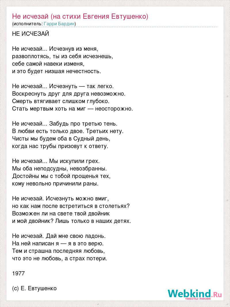 А как ты думаешь, о чем песня "Не исчезай (на стихи Евгения Евтушенко)" ?