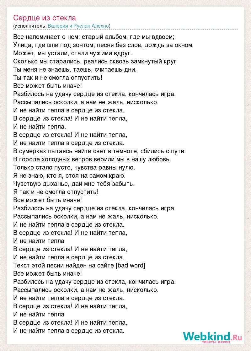 Все напоминает о нем: старый альбом, где мы вдвоем; Улица, где шли под зонтом; песня без слов, дождь за окном. Может, мы устали, стали чужими вдруг. Сколько мы старались, рвались сквозь замкнутый круг Ты меня не знаешь, таешь, считаешь дни. Ты так и не смогла отпустить! Все может быть иначе! Разбилось на удачу сердце из стекла, кончилась игра. Рассыпались осколки, а нам не жаль, нисколько. И не найти тепла в сердце из стекла. В сердце из стекла! И не найти тепла, И не найти тепла. В сердце из стекла! И не найти тепла, И не найти тепла в сердце из стекла. В сумерках пытаясь найти свет в темноте, сбились с пути. В городе холодных ветров верили мы в нашу любовь. Только стало пусто, чувства равны нулю. Я не знаю, кто я, стоя на самом краю. Чувствую дыханье, дай мне тебя забыть. Я так и не смогла отпустить! Все может быть иначе! Разбилось на удачу сердце из стекла, кончилась игра. Рассыпались осколки, а нам не жаль, нисколько. И не найти тепла в сердце из стекла. В сердце из стекла! И не найти тепла, И не найти тепла В сердце из стекла! И не найти тепла, И не найти тепла в сердце из стекла. Текст этой песни найден на сайте [bad word] Все может быть иначе! Разбилось на удачу сердце из стекла, кончилась игра. Рассыпались осколки, а нам не жаль, нисколько. И не найти тепла в сердце из стекла. В сердце из стекла! И не найти тепла, И не найти тепла В сердце из стекла! И не найти тепла, И не найти тепла в сердце из стекла.