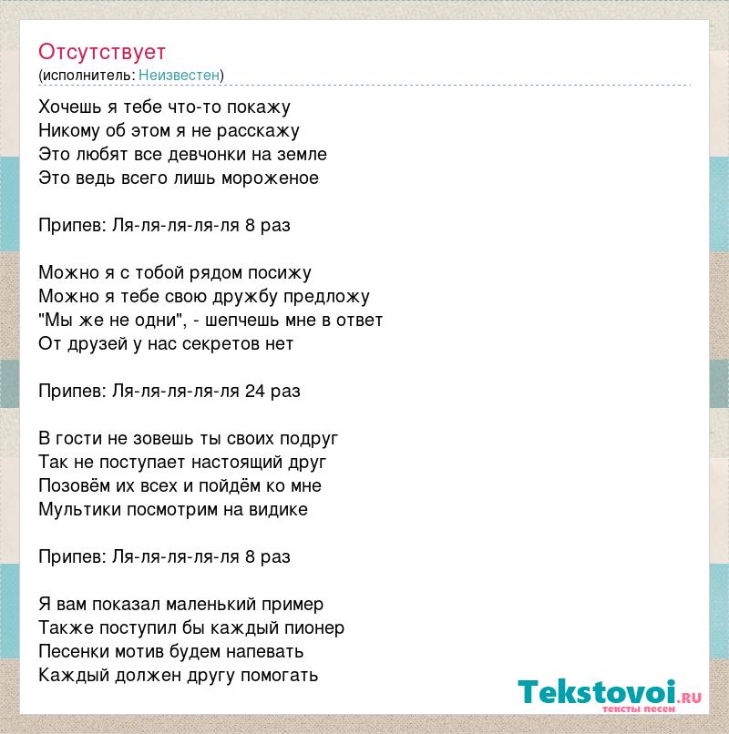 Хочешь я тебе что-то покажу Никому об этом я не расскажу Это любят все девчонки на земле Это ведь всего лишь мороженое Припев: Ля-ля-ля-ля-ля 8 раз Можно я с тобой рядом посижу Можно я тебе свою дружбу предложу "Мы же не одни", - шепчешь мне в ответ От друзей у нас секретов нет Припев: Ля-ля-ля-ля-ля 24 раз В гости не зовешь ты своих подруг Так не поступает настоящий друг Позовём их всех и пойдём ко мне Мультики посмотрим на видике Припев: Ля-ля-ля-ля-ля 8 раз Я вам показал маленький пример Также поступил бы каждый пионер Песенки мотив будем напевать Каждый должен другу помогать