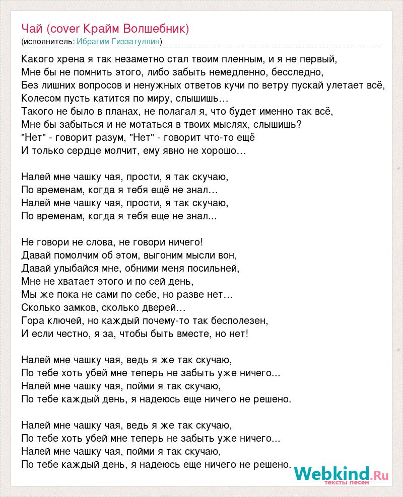 Какого хрена я так незаметно стал твоим пленным, и я не первый, Мне бы не помнить этого, либо забыть немедленно, бесследно, Без лишних вопросов и ненужных ответов кучи по ветру пускай улетает всё, Колесом пусть катится по миру, слышишь… Такого не было в планах, не полагал я, что будет именно так всё, Мне бы забыться и не мотаться в твоих мыслях, слышишь? "Нет" - говорит разум, "Нет" - говорит что-то ещё И только сердце молчит, ему явно не хорошо… Налей мне чашку чая, прости, я так скучаю, По временам, когда я тебя ещё не знал… Налей мне чашку чая, прости, я так скучаю, По временам, когда я тебя еще не знал... Не говори не слова, не говори ничего! Давай помолчим об этом, выгоним мысли вон, Давай улыбайся мне, обними меня посильней, Мне не хватает этого и по сей день, Мы же пока не сами по себе, но разве нет… Сколько замков, сколько дверей… Гора ключей, но каждый почему-то так бесполезен, И если честно, я за, чтобы быть вместе, но нет! Налей мне чашку чая, ведь я же так скучаю, По тебе хоть убей мне теперь не забыть уже ничего... Налей мне чашку чая, пойми я так скучаю, По тебе каждый день, я надеюсь еще ничего не решено. Налей мне чашку чая, ведь я же так скучаю, По тебе хоть убей мне теперь не забыть уже ничего... Налей мне чашку чая, пойми я так скучаю, По тебе каждый день, я надеюсь еще ничего не решено.
