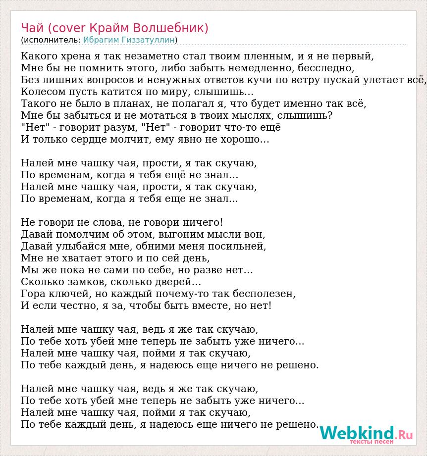 Какого хрена я так незаметно стал твоим пленным, и я не первый, Мне бы не помнить этого, либо забыть немедленно, бесследно, Без лишних вопросов и ненужных ответов кучи по ветру пускай улетает всё, Колесом пусть катится по миру, слышишь… Такого не было в планах, не полагал я, что будет именно так всё, Мне бы забыться и не мотаться в твоих мыслях, слышишь? "Нет" - говорит разум, "Нет" - говорит что-то ещё И только сердце молчит, ему явно не хорошо… Налей мне чашку чая, прости, я так скучаю, По временам, когда я тебя ещё не знал… Налей мне чашку чая, прости, я так скучаю, По временам, когда я тебя еще не знал... Не говори не слова, не говори ничего! Давай помолчим об этом, выгоним мысли вон, Давай улыбайся мне, обними меня посильней, Мне не хватает этого и по сей день, Мы же пока не сами по себе, но разве нет… Сколько замков, сколько дверей… Гора ключей, но каждый почему-то так бесполезен, И если честно, я за, чтобы быть вместе, но нет! Налей мне чашку чая, ведь я же так скучаю, По тебе хоть убей мне теперь не забыть уже ничего... Налей мне чашку чая, пойми я так скучаю, По тебе каждый день, я надеюсь еще ничего не решено. Налей мне чашку чая, ведь я же так скучаю, По тебе хоть убей мне теперь не забыть уже ничего... Налей мне чашку чая, пойми я так скучаю, По тебе каждый день, я надеюсь еще ничего не решено.