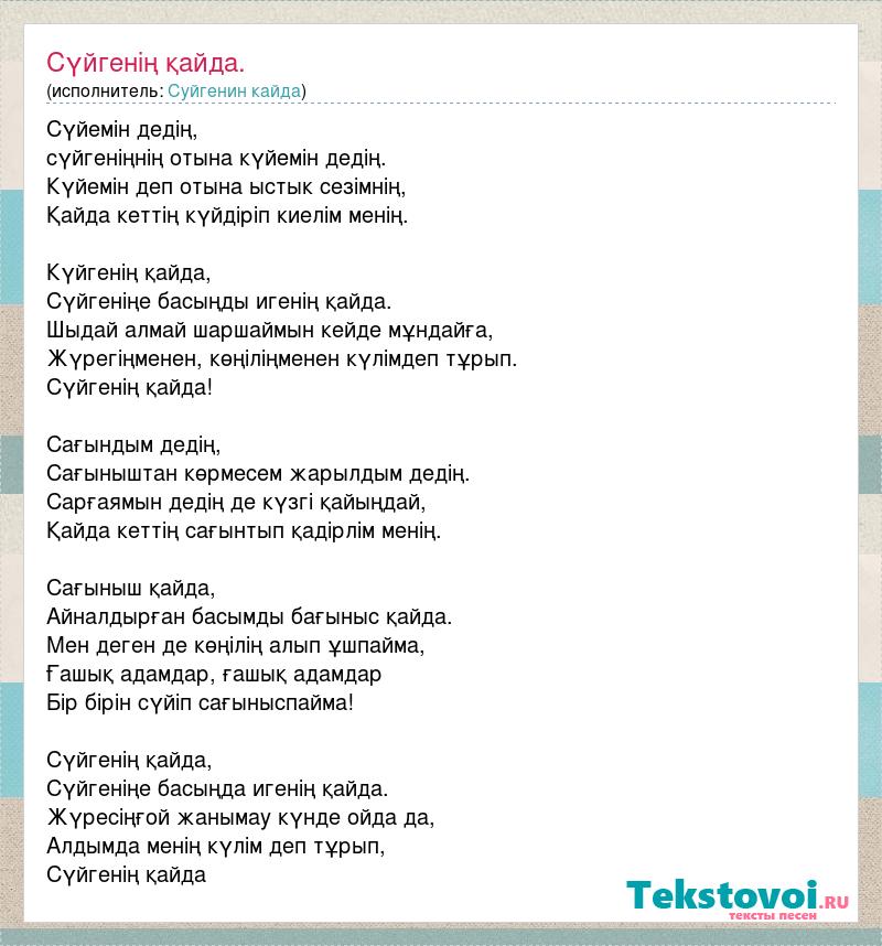 Сүйемін дедің, сүйгеніңнің отына күйемін дедің. Күйемін деп отына ыстык сезімнің, Қайда кеттің күйдіріп киелім менің. Күйгенің қайда, Сүйгеніңе басыңды игенің қайда. Шыдай алмай шаршаймын кейде мұндайға, Жүрегіңменен, көңіліңменен күлімдеп тұрып. Сүйгенің қайда! Сағындым дедің, Сағыныштан көрмесем жарылдым дедің. Сарғаямын дедің де күзгі қайыңдай, Қайда кеттің сағынтып қадірлім менің. Сағыныш қайда, Айналдырған басымды бағыныс қайда. Мен деген де көңілің алып ұшпайма, Ғашық адамдар, ғашық адамдар Бір бірін сүйіп сағыныспайма! Сүйгенің қайда, Сүйгеніңе басыңда игенің қайда. Жүресіңғой жанымау күнде ойда да, Алдымда менің күлім деп тұрып, Сүйгенің қайда