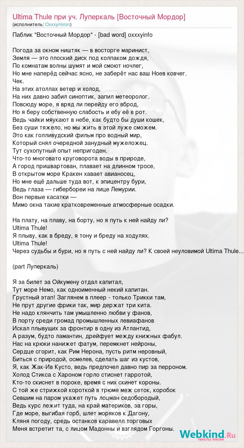 Паблик "Восточный Мордор" - [bad word] oxxxyinfo Погода за окном ништяк — в восторге маринист, Земля — это плоский диск под колпаком дождя, По комнатам волны шумят и мой смоют ночлег, Но мне наперёд сейчас ясно, не заберёт нас ваш Ноев ковчег. Чек. На этих атоллах ветер и холод, На них давно забил синоптик, запил метеоролог. Повсюду море, я вряд ли перейду его вброд, Но я беру собственную слабость и ебу её в рот. Ведь чайки мяукают в небе, как будто бы души кошек, Без суши тяжело, но мы жить в этой луже сможем. Это как голливудский фильм про водный мир, Который снял очередной занудный мужеложец. Тут сухопутный опыт непригоден. Что-то многовато круговорота воды в природе, А город пришвартован, плавает на длинном тросе, В открытом море Кракен хавает авианосец, Но мне ещё дальше туда вот, к эпицентру бури, Ведь глаза — гибербореи на лице Лемурии. Вон первые касатки — Мимо окна такие кратковременные атмосферные осадки. На плату, на плаву, на борту, но я путь к ней найду ли? Ultima Thule! Я плыву, как в бреду, я тону и бреду на ходулях. Ultima Thule! Через судьбы и бури, но я путь с ней найду ли? К своей неуловимой Ultima Thule... (part Луперкаль) Я за билет за Ойкумену отдал капитал, Тут море Немо, как одноименный некий капитан. Грустный этап! Заглянем в плеер - только Трикки там, Не прут другие фрики так, мир держат три кита. Не надо клянчить там умышленно любви у фанов, В порту среди громад промышленных левиафанов Искал плывущих за фронтир в одну из Атлантид, А разум, будто ламантин, дрейфует между книжных фабул. Нас на крюки нанижет фатум, перемкнет нейроны, Сердце сгорит, как Рим Нерона, пусть ритм неровный, Биться с природой, осмелев, сделать шаг из кустов, Я, как Жак-Ив Кусто, ведь предпочел давно пир за перроном. Холод Стикса с Хароном горло стиснет гарротой, Кто-то скиснет в пороке, время с них скинет короны. С той же стрижкой короткой в трюме меж сеток, коробок Севшим на паром укажет путь лоцман седобородый, Ведь курс лежит туда, на край материков, за горы, Где море, выгибая горб, шлет моряков к Дагону, Кляня погоду, средь останков каравелл торговых Меня встретит та, с лицом Мадонны и взглядом Горгоны.