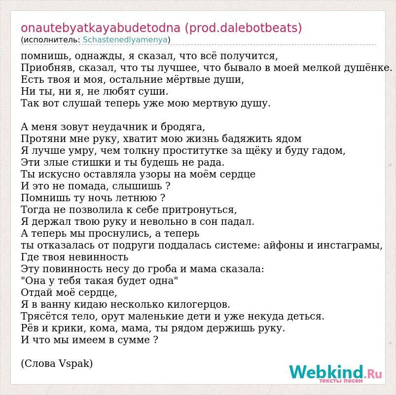помнишь, однажды, я сказал, что всё получится, Приобняв, сказал, что ты лучшее, что бывало в моей мелкой душёнке. Есть твоя и моя, остальние мёртвые души, Ни ты, ни я, не любят суши. Так вот слушай теперь уже мою мертвую душу. А меня зовут неудачник и бродяга, Протяни мне руку, хватит мою жизнь бадяжить ядом Я лучше умру, чем толкну проститутке за щёку и буду гадом, Эти злые стишки и ты будешь не рада. Ты искусно оставляла узоры на моём сердце И это не помада, слышишь ? Помнишь ту ночь летнюю ? Тогда не позволила к себе притронуться, Я держал твою руку и невольно в сон падал. А теперь мы проснулись, а теперь ты отказалась от подруги поддалась системе: айфоны и инстаграмы, Где твоя невинность Эту повинность несу до гроба и мама сказала: "Она у тебя такая будет одна" Отдай моё сердце, Я в ванну кидаю несколько килогерцов. Трясётся тело, орут маленькие дети и уже некуда деться. Рёв и крики, кома, мама, ты рядом держишь руку. И что мы имеем в сумме ? (Слова Vspak)