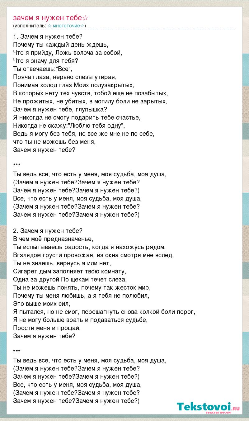 1. Зачем я нужен тебе? Почему ты каждый день ждешь, Что я прийду, Ложь волоча за собой, Что я значу для тебя? Ты отвечаешь:"Все", Пряча глаза, нервно слезы утирая, Понимая холод глаз Моих полузакрытых, В которых нету тех чувств, тобой еще не позабытых, Не прожитых, не убитых, в могилу боли не зарытых, Зачем я нужен тебе, глупышка? Я никогда не смогу подарить тебе счастье, Никогда не скажу:"Люблю тебя одну", Ведь я могу без тебя, но все же мне не по себе, что ты не можешь без меня, Зачем я нужен тебе? *** Ты ведь все, что есть у меня, моя судьба, моя душа, (Зачем я нужен тебе?Зачем я нужен тебе? Зачем я нужен тебе?Зачем я нужен тебе?) Все, что есть у меня, моя судьба, моя душа, (Зачем я нужен тебе?Зачем я нужен тебе? Зачем я нужен тебе?Зачем я нужен тебе?) 2. Зачем я нужен тебе? В чем моё предназначенье, Ты испытываешь радость, когда я нахожусь рядом, Вгзлядом грусти провожая, из окна смотря мне вслед, Ты не знаешь, вернусь я или нет, Сигарет дым заполняет твою комнату, Одна за другой По щекам течет слеза, Ты не можешь понять, почему так жесток мир, Почему ты меня любишь, а я тебя не полюбил, Это выше моих сил, Я пытался, но не смог, перешагнуть снова колкой боли порог, Я не могу больше врать и подаваться судьбе, Прости меня и прощай, Зачем я нужен тебе? *** Ты ведь все, что есть у меня, моя судьба, моя душа, (Зачем я нужен тебе?Зачем я нужен тебе? Зачем я нужен тебе?Зачем я нужен тебе?) Все, что есть у меня, моя судьба, моя душа, (Зачем я нужен тебе?Зачем я нужен тебе? Зачем я нужен тебе?Зачем я нужен тебе?)