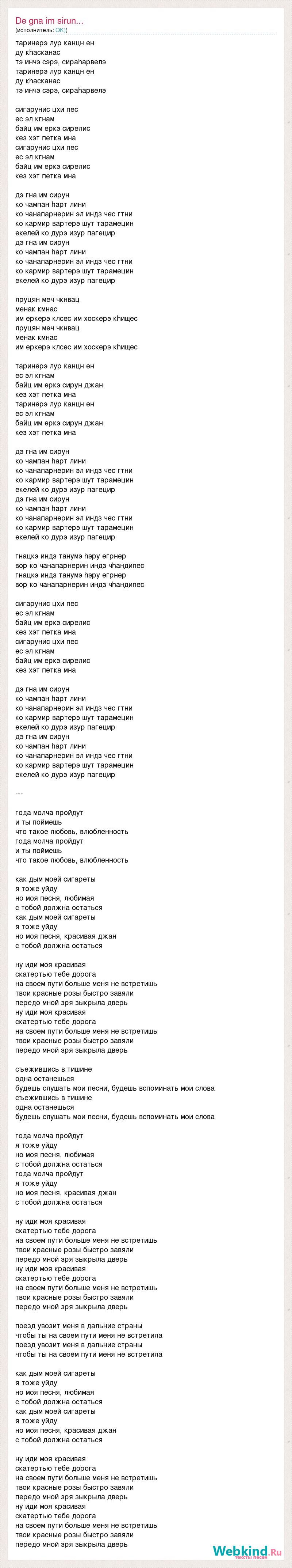 таринерэ лур канцн ен ду кhасканас тэ инчэ сэрэ, сираhарвелэ таринерэ лур канцн ен ду кhасканас тэ инчэ сэрэ, сираhарвелэ сигарунис цхи пес ес эл кгнам байц им еркэ сирелис кез хэт петка мна сигарунис цхи пес ес эл кгнам байц им еркэ сирелис кез хэт петка мна дэ гна им сирун ко чампан hарт лини ко чанапарнерин эл индз чес гтни ко кармир вартерэ шут тарамецин екелей ко дурэ изур пагецир дэ гна им сирун ко чампан hарт лини ко чанапарнерин эл индз чес гтни ко кармир вартерэ шут тарамецин екелей ко дурэ изур пагецир лруцян меч чкнвац менак кмнас им еркерэ клсес им хоскерэ кhищес лруцян меч чкнвац менак кмнас им еркерэ клсес им хоскерэ кhищес таринерэ лур канцн ен ес эл кгнам байц им еркэ сирун джан кез хэт петка мна таринерэ лур канцн ен ес эл кгнам байц им еркэ сирун джан кез хэт петка мна дэ гна им сирун ко чампан hарт лини ко чанапарнерин эл индз чес гтни ко кармир вартерэ шут тарамецин екелей ко дурэ изур пагецир дэ гна им сирун ко чампан hарт лини ко чанапарнерин эл индз чес гтни ко кармир вартерэ шут тарамецин екелей ко дурэ изур пагецир гнацкэ индз танумэ hэру егрнер вор ко чанапарнерин индз чhандипес гнацкэ индз танумэ hэру егрнер вор ко чанапарнерин индз чhандипес сигарунис цхи пес ес эл кгнам байц им еркэ сирелис кез хэт петка мна сигарунис цхи пес ес эл кгнам байц им еркэ сирелис кез хэт петка мна дэ гна им сирун ко чампан hарт лини ко чанапарнерин эл индз чес гтни ко кармир вартерэ шут тарамецин екелей ко дурэ изур пагецир дэ гна им сирун ко чампан hарт лини ко чанапарнерин эл индз чес гтни ко кармир вартерэ шут тарамецин екелей ко дурэ изур пагецир --- года молча пройдут и ты поймешь что такое любовь, влюбленность года молча пройдут и ты поймешь что такое любовь, влюбленность как дым моей сигареты я тоже уйду но моя песня, любимая с тобой должна остаться как дым моей сигареты я тоже уйду но моя песня, красивая джан с тобой должна остаться ну иди моя красивая скатертью тебе дорога на своем пути больше меня не встретишь твои красные розы быстро завяли передо мной зря зыкрыла дверь ну иди моя красивая скатертью тебе дорога на своем пути больше меня не встретишь твои красные розы быстро завяли передо мной зря зыкрыла дверь съежившись в тишине одна останешься будешь слушать мои песни, будешь вспоминать мои слова съежившись в тишине одна останешься будешь слушать мои песни, будешь вспоминать мои слова года молча пройдут я тоже уйду но моя песня, любимая с тобой должна остаться года молча пройдут я тоже уйду но моя песня, красивая джан с тобой должна остаться ну иди моя красивая скатертью тебе дорога на своем пути больше меня не встретишь твои красные розы быстро завяли передо мной зря зыкрыла дверь ну иди моя красивая скатертью тебе дорога на своем пути больше меня не встретишь твои красные розы быстро завяли передо мной зря зыкрыла дверь поезд увозит меня в дальние страны чтобы ты на своем пути меня не встретила поезд увозит меня в дальние страны чтобы ты на своем пути меня не встретила как дым моей сигареты я тоже уйду но моя песня, любимая с тобой должна остаться как дым моей сигареты я тоже уйду но моя песня, красивая джан с тобой должна остаться ну иди моя красивая скатертью тебе дорога на своем пути больше меня не встретишь твои красные розы быстро завяли передо мной зря зыкрыла дверь ну иди моя красивая скатертью тебе дорога на своем пути б