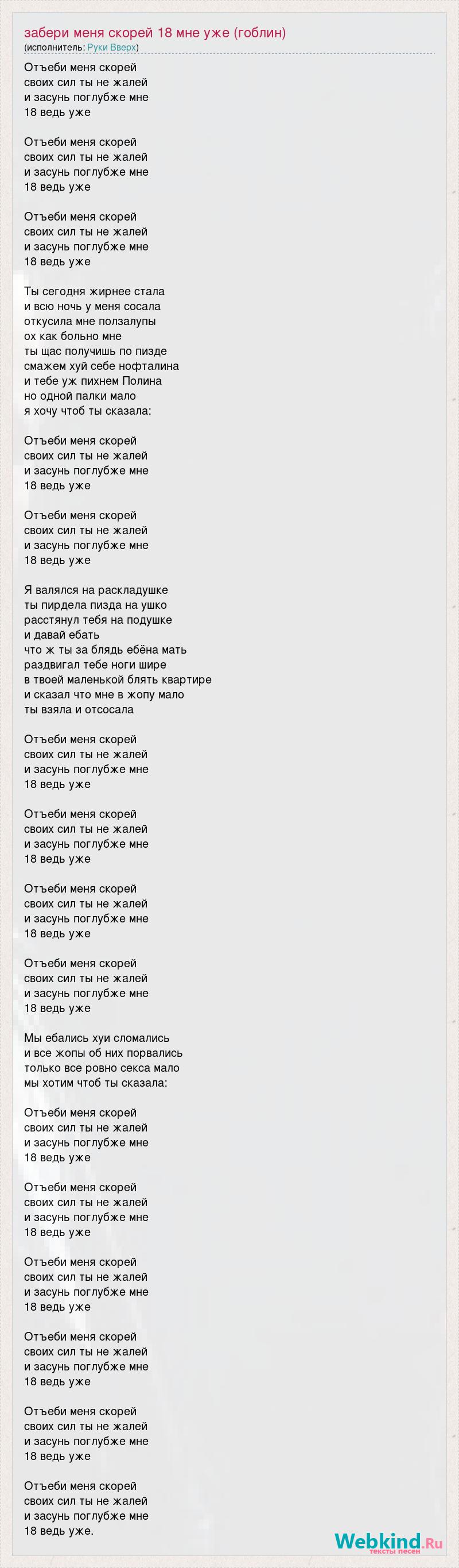 Отъеби меня скорей своих сил ты не жалей и засунь поглубже мне 18 ведь уже Отъеби меня скорей своих сил ты не жалей и засунь поглубже мне 18 ведь уже Отъеби меня скорей своих сил ты не жалей и засунь поглубже мне 18 ведь уже Ты сегодня жирнее стала и всю ночь у меня сосала откусила мне ползалупы ох как больно мне ты щас получишь по пизде смажем хуй себе нофталина и тебе уж пихнем Полина но одной палки мало я хочу чтоб ты сказала: Отъеби меня скорей своих сил ты не жалей и засунь поглубже мне 18 ведь уже Отъеби меня скорей своих сил ты не жалей и засунь поглубже мне 18 ведь уже Я валялся на раскладушке ты пирдела пизда на ушко расстянул тебя на подушке и давай ебать что ж ты за блядь ебёна мать раздвигал тебе ноги шире в твоей маленькой блять квартире и сказал что мне в жопу мало ты взяла и отсосала Отъеби меня скорей своих сил ты не жалей и засунь поглубже мне 18 ведь уже Отъеби меня скорей своих сил ты не жалей и засунь поглубже мне 18 ведь уже Отъеби меня скорей своих сил ты не жалей и засунь поглубже мне 18 ведь уже Отъеби меня скорей своих сил ты не жалей и засунь поглубже мне 18 ведь уже Мы ебались хуи сломались и все жопы об них порвались только все ровно секса мало мы хотим чтоб ты сказала: Отъеби меня скорей своих сил ты не жалей и засунь поглубже мне 18 ведь уже Отъеби меня скорей своих сил ты не жалей и засунь поглубже мне 18 ведь уже Отъеби меня скорей своих сил ты не жалей и засунь поглубже мне 18 ведь уже Отъеби меня скорей своих сил ты не жалей и засунь поглубже мне 18 ведь уже Отъеби меня скорей своих сил ты не жалей и засунь поглубже мне 18 ведь уже Отъеби меня скорей своих сил ты не жалей и засунь поглубже мне 18 ведь уже.