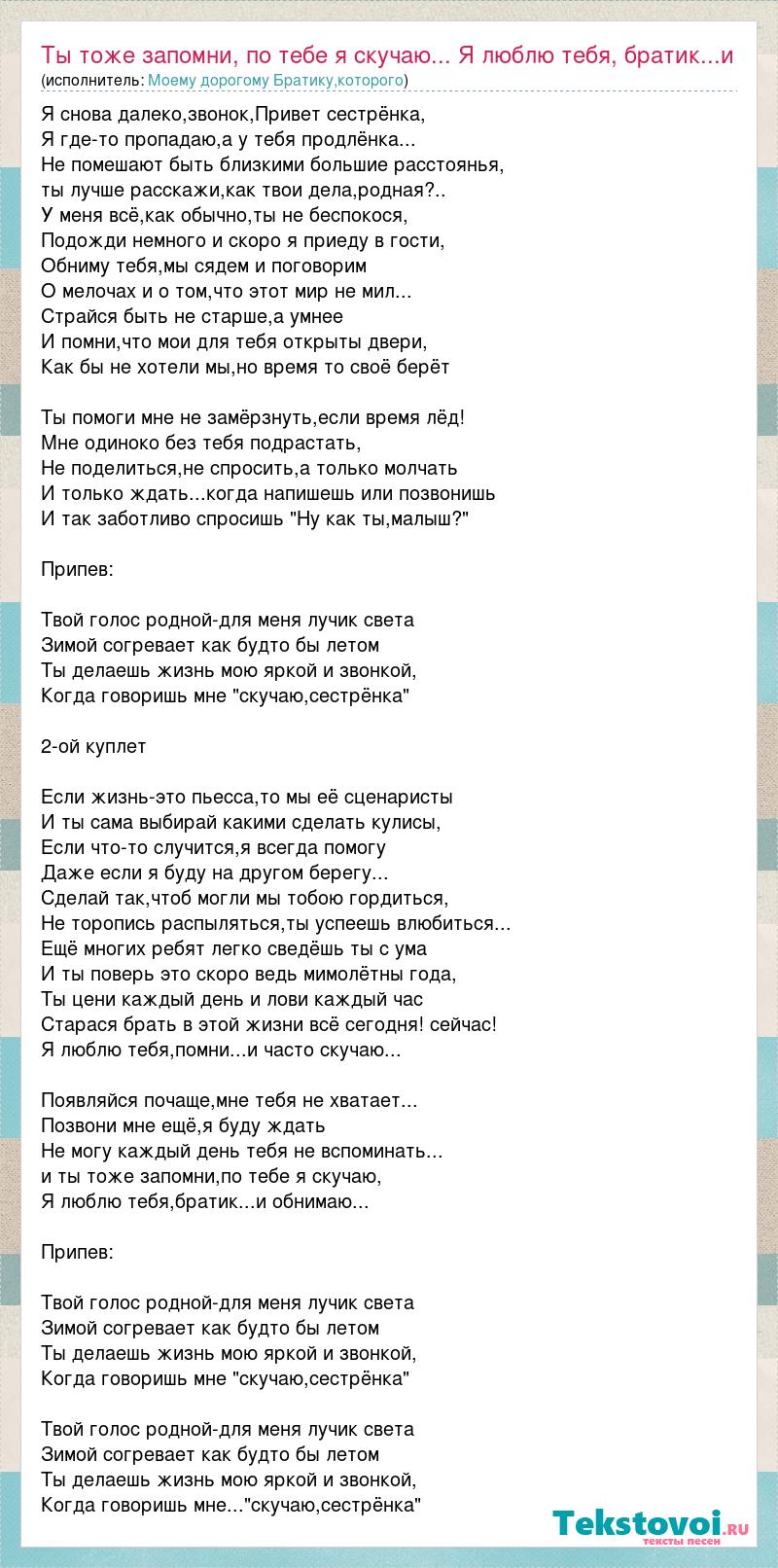 Я снова далеко,звонок,Привет сестрёнка, Я где-то пропадаю,а у тебя продлёнка... Не помешают быть близкими большие расстоянья, ты лучше расскажи,как твои дела,родная?.. У меня всё,как обычно,ты не беспокося, Подожди немного и скоро я приеду в гости, Обниму тебя,мы сядем и поговорим О мелочах и о том,что этот мир не мил... Страйся быть не старше,а умнее И помни,что мои для тебя открыты двери, Как бы не хотели мы,но время то своё берёт Ты помоги мне не замёрзнуть,если время лёд! Мне одиноко без тебя подрастать, Не поделиться,не спросить,а только молчать И только ждать...когда напишешь или позвонишь И так заботливо спросишь "Ну как ты,малыш?" Припев: Твой голос родной-для меня лучик света Зимой согревает как будто бы летом Ты делаешь жизнь мою яркой и звонкой, Когда говоришь мне "скучаю,сестрёнка" 2-ой куплет Если жизнь-это пьесса,то мы её сценаристы И ты сама выбирай какими сделать кулисы, Если что-то случится,я всегда помогу Даже если я буду на другом берегу... Сделай так,чтоб могли мы тобою гордиться, Не торопись распыляться,ты успеешь влюбиться... Ещё многих ребят легко сведёшь ты с ума И ты поверь это скоро ведь мимолётны года, Ты цени каждый день и лови каждый час Старася брать в этой жизни всё сегодня! сейчас! Я люблю тебя,помни...и часто скучаю... Появляйся почаще,мне тебя не хватает... Позвони мне ещё,я буду ждать Не могу каждый день тебя не вспоминать... и ты тоже запомни,по тебе я скучаю, Я люблю тебя,братик...и обнимаю... Припев: Твой голос родной-для меня лучик света Зимой согревает как будто бы летом Ты делаешь жизнь мою яркой и звонкой, Когда говоришь мне "скучаю,сестрёнка" Твой голос родной-для меня лучик света Зимой согревает как будто бы летом Ты делаешь жизнь мою яркой и звонкой, Когда говоришь мне..."скучаю,сестрёнка"